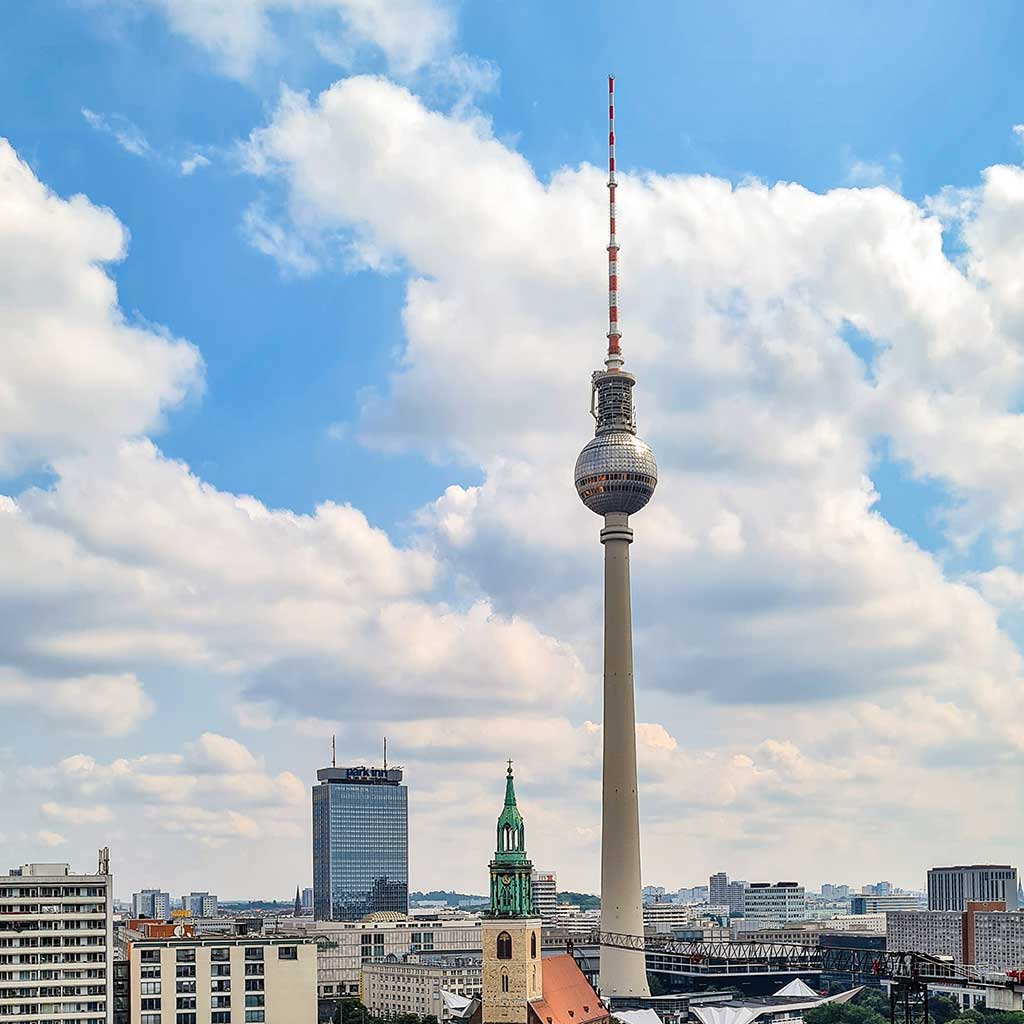 Auf der anderen Seite blickst du direkt auf den Fernsehturm, links davon liegt das Park-Inn-Hotel. Der Kuppelrundgang ist im Eintrittspreis des Doms enthalten und auf jeden Fall sein Geld wert.