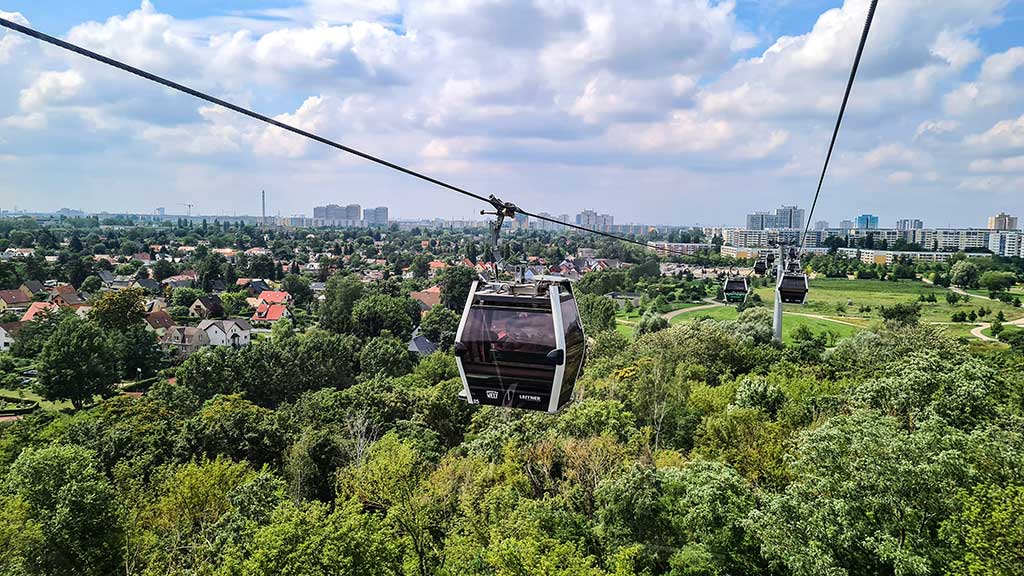 Ich quere die Straße und steige dann in die Seilbahn. Mit ihr schaukele ich dann gemütlich über das Wuhletal, den Kienberg hoch und dann wieder bergab bis zum Eingang der Gartenschau. Der spektakuläre Ausblick aus 35 Metern Höhe soll bei klarer Sicht bis ins Zentrum Berlins reichen. Heute ist es diesig und gewittrig, aber ich finde die Aussicht auf Marzahn und Hellersdorf auch sehr beeindruckend.