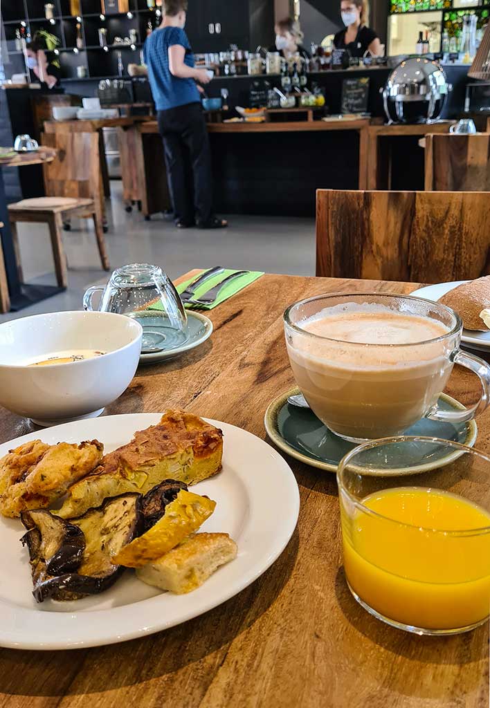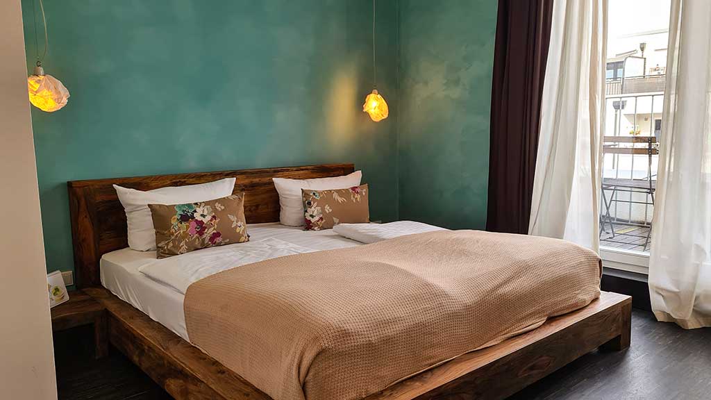 Von Sonntag auf Montag übernachte ich im Almodóvar-Hotel. Das Biohotel passt perfekt in den Kiez und zum Lebensgefühl von Friedrichshain. Von außen sieht der Neubau ein bisschen klotzig aus wie ein Bürogebäude. Doch lass dich davon nicht abschrecken. Es ist sehr chic und mit viel Liebe zum Detail eingerichtet. Mein Zimmer befindet sich im 5. Stock und hat einen kleinen Balkon mit Blick auf die Boxhagener Straße. Mir gefällt die Farbkombination von türkisgrünen Wänden, weißen luftigen Gardinen, Designerlampen und geölten Massivholz-Möbeln aus Palisander. Toll, hier würde ich es auch länger als eine Nacht aushalten. Sehr liebevoll sind die Details im Bad und es gibt sogar eine Yogamatte. Ohm…