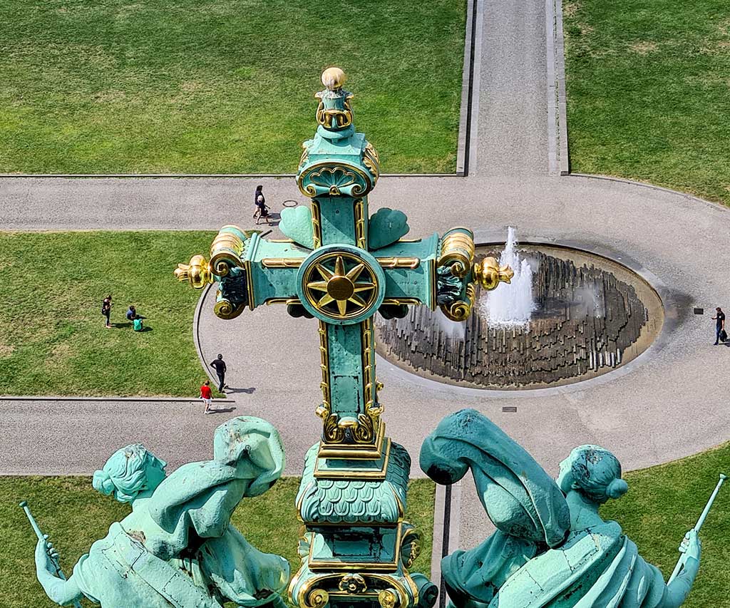 Doch ich halte mich nicht lange mit dem Innenleben auf, sondern nehme die Treppe nach oben. 270 Stufen sind es. Beim Kuppelrundgang sind die Mühen schnell vergessen, denn es eröffnet sich ein wunderschöner Blick über Berlins historische Mitte mit Fernsehturm, Spree und Nikolaiviertel. Die breite Brüstung sorgt für Sicherheit und deshalb ist keine zusätzliche Sicherung durch Glas oder Gitter notwendig. Toll, denn vom Gefühl schwebst du oben und bist doch dem Treiben unten nah. Ich sehe die Schiffe auf der Spree vorbeifahren und höre Musik aus dem Lustgarten. Auch der Fernsehturm erscheint zum Greifen nah.