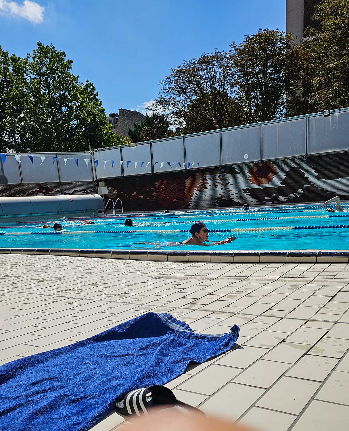 Am anderen Ende der Metrolinie 5, im 13. Arrondissement, liegt das beeindruckende Jugendstilbad Piscine de la Buttes aux Cailles, eines der ältesten und charmantesten Schwimmbäder von Paris. Dieses denkmalgeschützte Bad bietet dir die Möglichkeit, sowohl drinnen als auch draußen zu schwimmen. Die hohen Mauern schützen vor neugierigen Blicken, was das Schwimmen besonders angenehm macht. Eine weitere Besonderheit: Das Bad macht täglich Mittagspause. Ich habe es bei einem Spaziergang durchs 13. Arrondissement entdeckt und hatte während Olympia 2024 Gelegenheit, dort zu schwimmen. Es ist recht klein mit zwei Außen- und einem Innenbecken und hat so seine Regeln: Badekappen sind Pflicht! Laufen, springen, fotografieren verboten. Angenehmes Publikum, hauptsächlich Einwohner aus der Nachbarschaft.