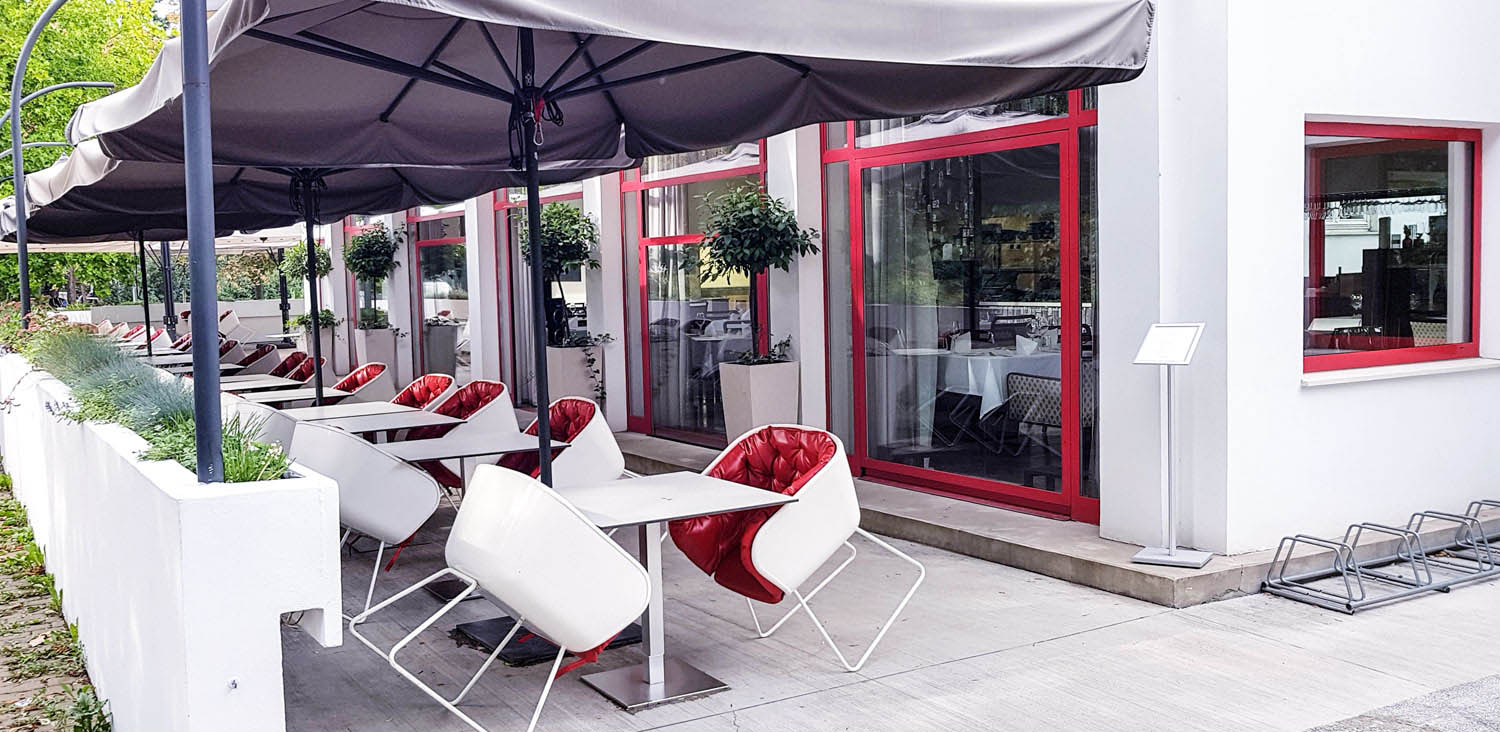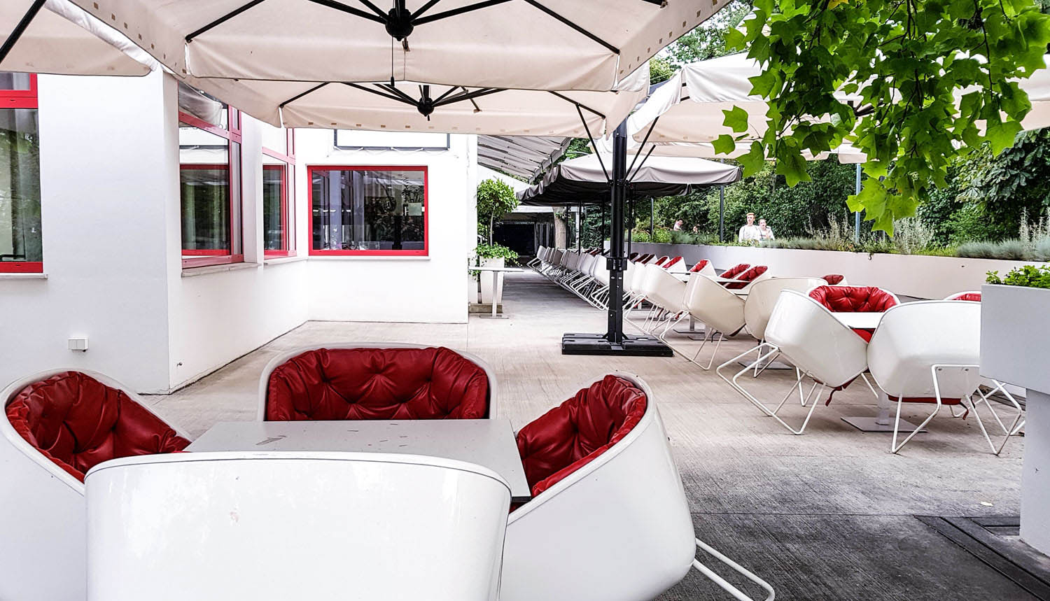 Knuffig und stylish finde ich diese weißen Sessel mit lackrotem Knautschleder. Sie stehen auf der Terrasse des Restaurant Pavillon im Zentrum nahe dem Janáček-Theater. Das Café Zemann (so wurde es früher genannt) war 1925 in Brünn das erste Gebäude mit geometrischen Formen. Im Hintergrund auf dem Foto siehst du die Schiebefenster mit rotem Rahmen, die im Sommer entfernt werden können, damit das Innere perfekt mit dem Äußeren verbunden ist.