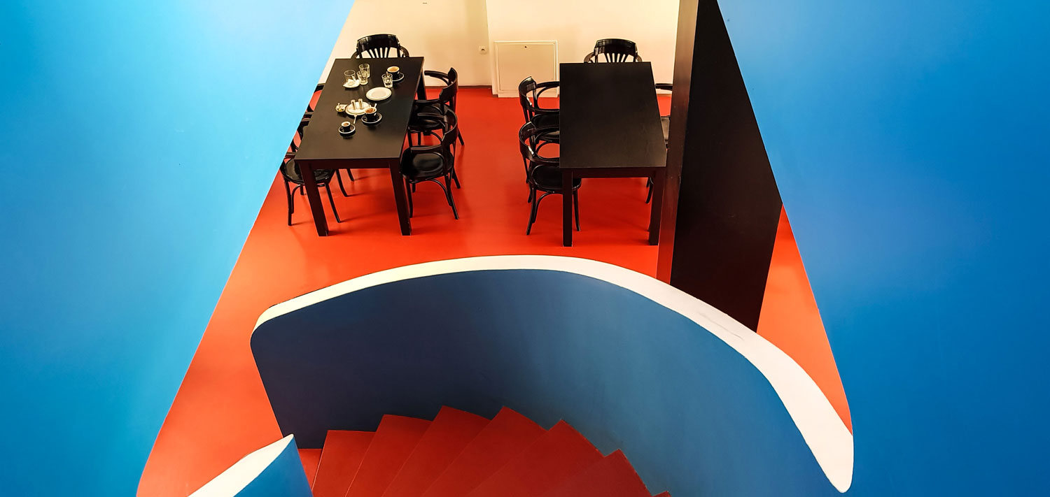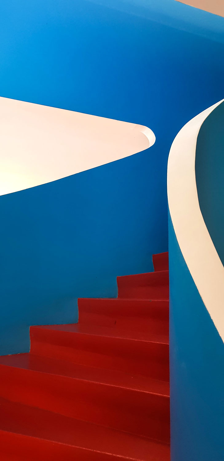 Von außen wirkt das Gebäude minimalistisch und funktional. Fenster in verschiedenen Größen bilden Bänder und gliedern die Fassade horizontal. Drinnen sticht die blaue Wendeltreppe, die das Erdgeschoss des Cafés mit dem Obergeschoss verbindet, sofort ins Auge. Auffällig ist der rote Fußboden. Den coolsten Blick hast du von der obersten Stufe der Wendeltreppe: organische Formen in weiß, blau und rot scheinen ineinander zu laufen.