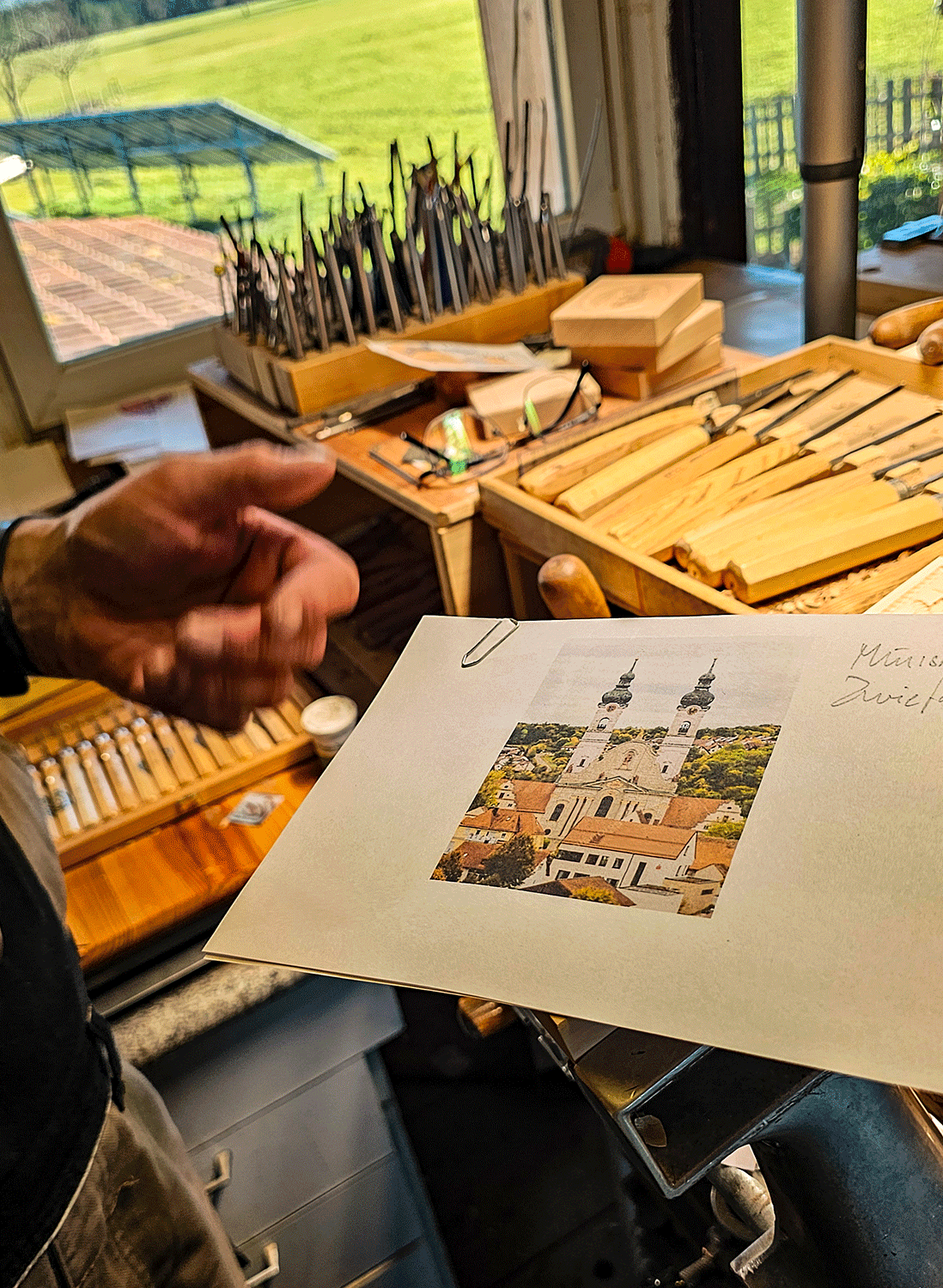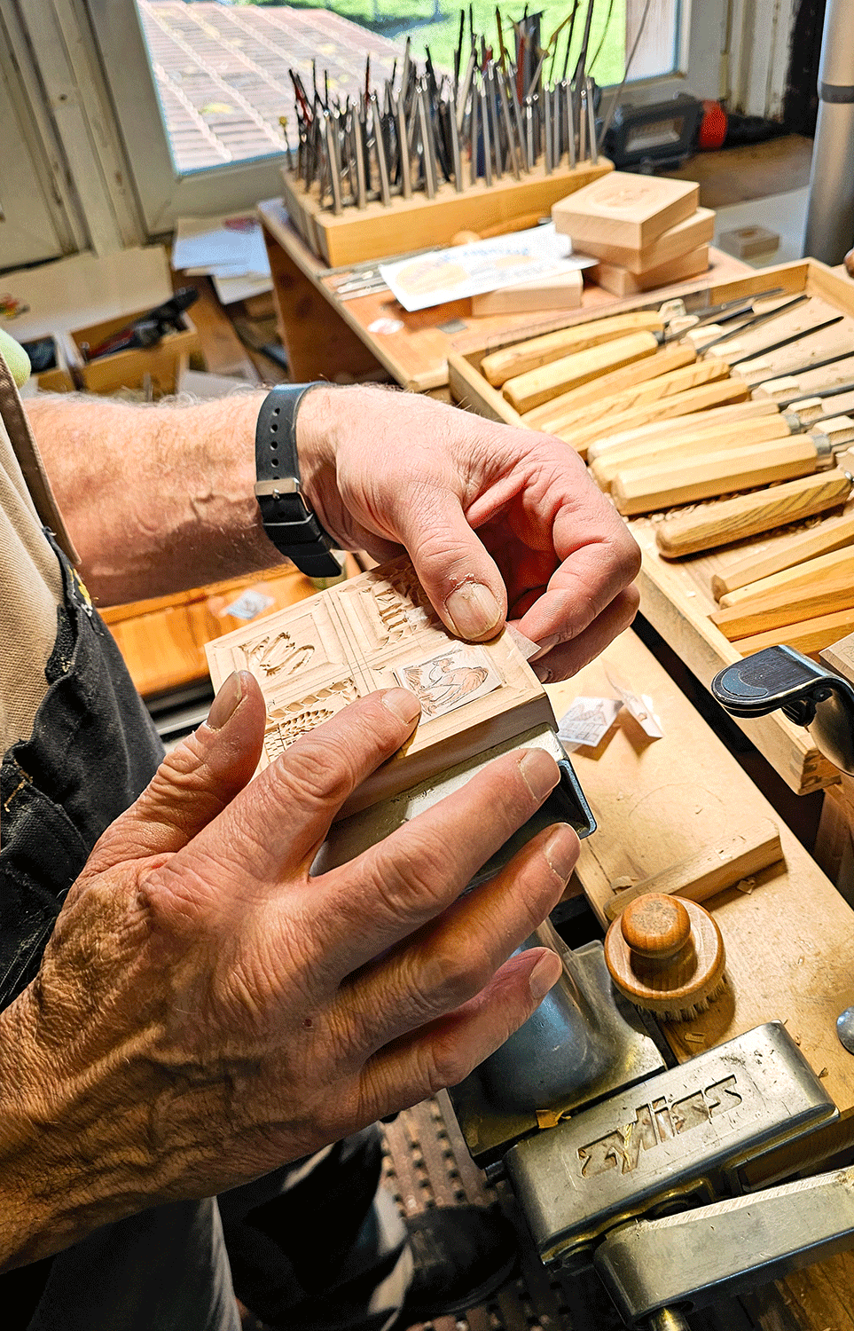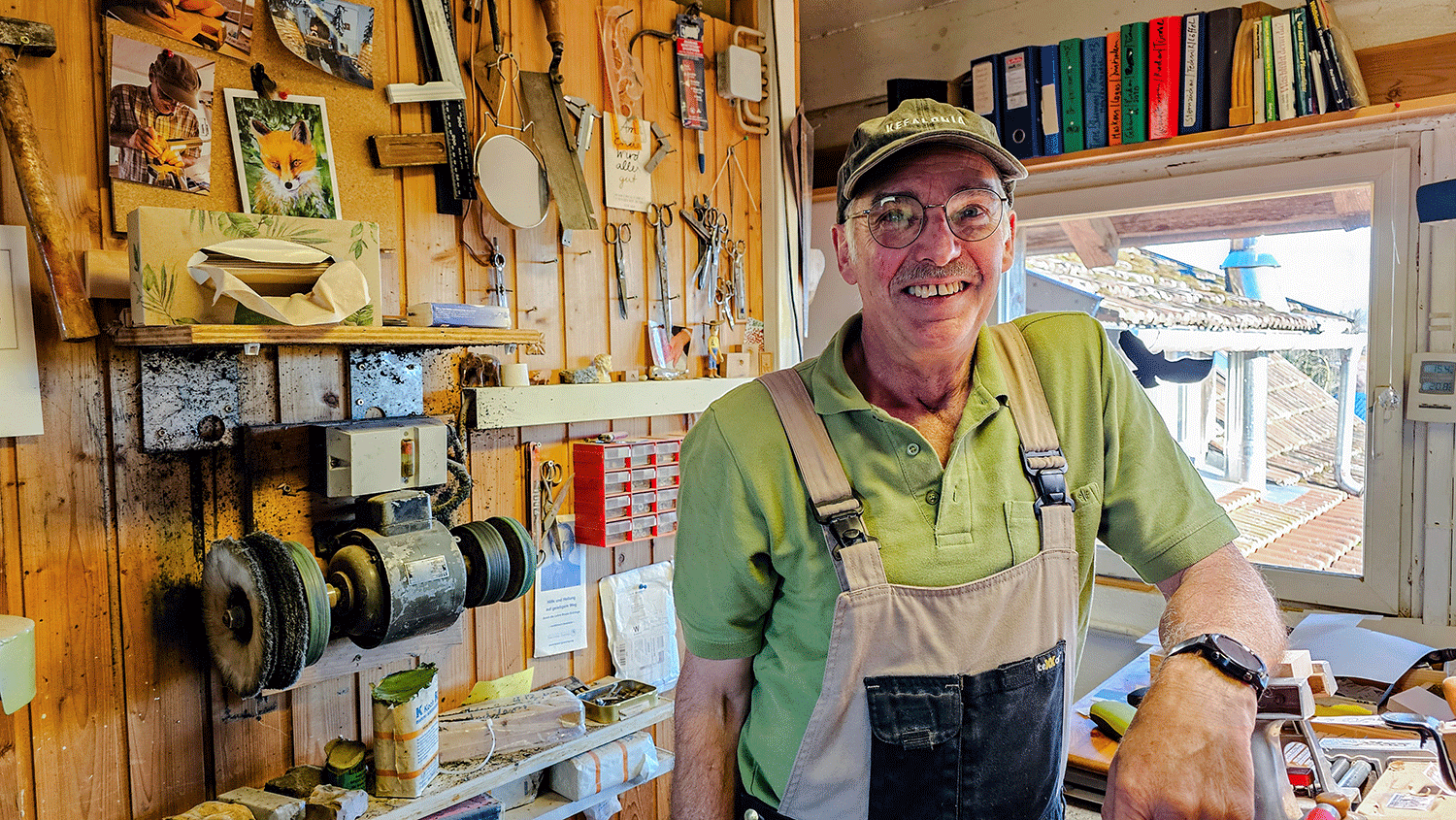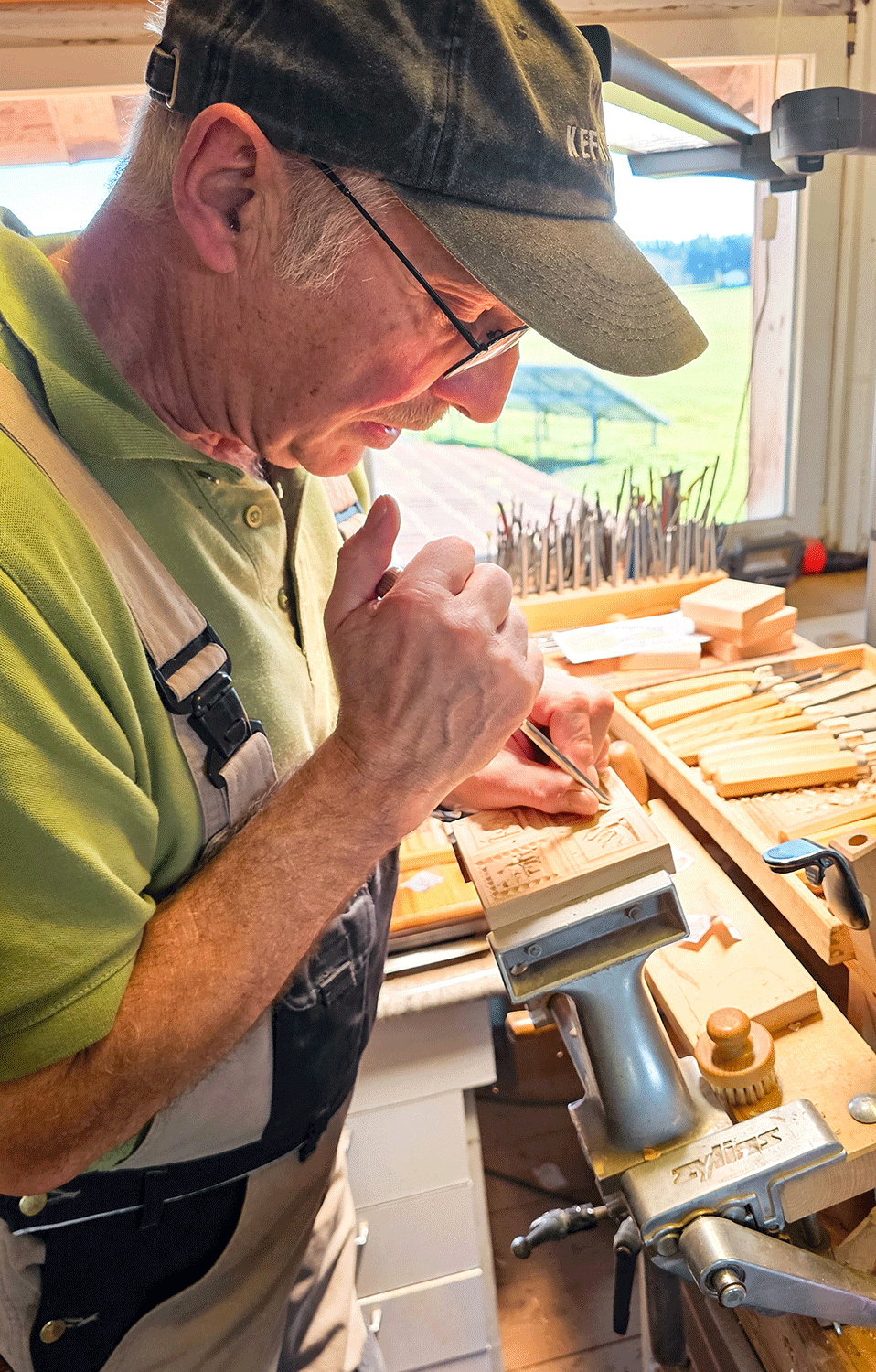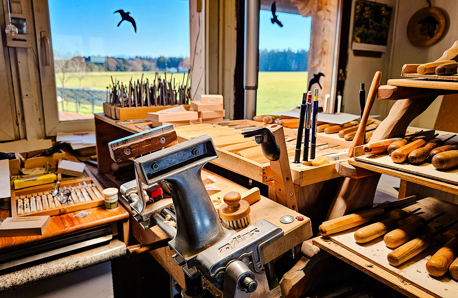 Ich schaue mich um: Seine Werkstatt ist voller Werkzeuge in unterschiedlichsten Formen und Größen – über 700 sind es, viele haben für Angele auch eine persönliche Geschichte. Neben den Stechbeiteln, Punzen und Hämmern liegen fertige Model, Zeichnungen und Vorlagen. Ein ausgestopfter Fuchs an der Wand überwacht das Geschehen. Gemütlich ist es hier in der Schnitzstube des Herrn Angele, die an diesem Dezembernachmittag von goldenem Sonnenlicht durchflutet wird.