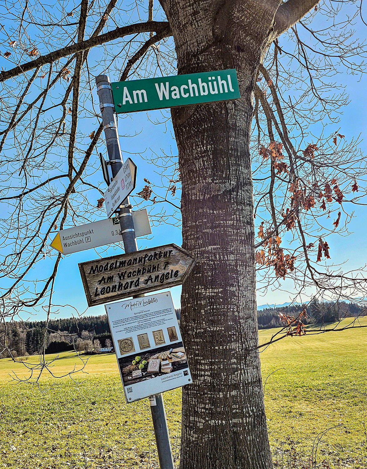 Weihnachten naht, und ich verbringe noch ein paar erholsame Tage in Bad Wurzach am Hauptwanderweg HW 5. Am Donnerstag scheint die Sonne – wie gemacht für einen kleinen Wanderausflug zum Wachbühl 7. Dort befindet sich die Modelwerkstatt von Leonhard Angele. Sein Hinweisschild ist mir schon bei einer früheren Wanderung aufgefallen – nun ist endlich Zeit für einen Besuch. Die Werkstatt liegt in einer ehemaligen Scheune eines idyllisch gelegenen Bauernhofes.