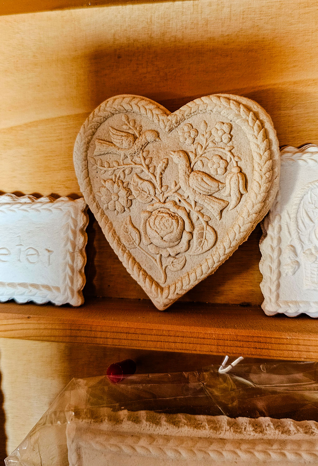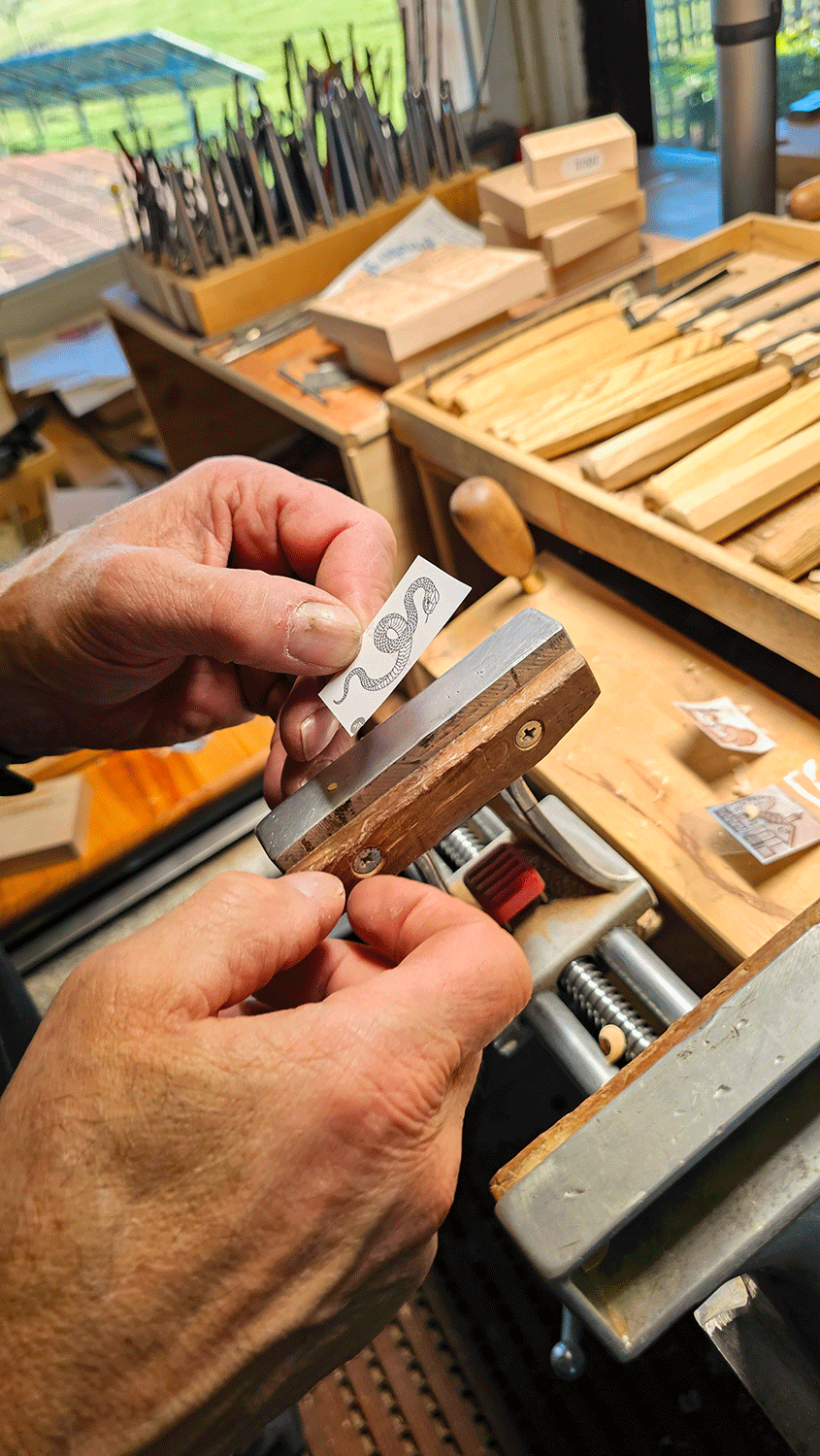 Gefertigt werden die Backformen aus Birnbaumholz, einem mittelfesten, kurzfaserigen Material, das sich besonders gut für präzise Schnitzarbeiten eignet. Im ersten Schritt fertigt Angele eine Zeichnung des Motiv in Originalgröße des Models an. Anschließend überträgt er die Zeichnung mit einem Blaupapier spiegelbildlich aufs Holz – ob Schlange oder ein altes Erbstück, das vervielfältigt werden soll. Dann bearbeitet er das Holz mit rasiermesserscharfen Stecheisen, sogenannten Stechbeiteln. Was leicht und geschmeidig aussieht, erfordert viel Erfahrung, Kraft und ein sicheres Gespür für das richtige Werkzeug. „Das Besondere an der Modelstecherei ist, dass alles spiegelbildlich und negativ geschnitzt wird“, erklärt er mir. Und damit das Motiv später plastisch erscheint, müssen verschiedene Ebenen in Holz gearbeitet werden.