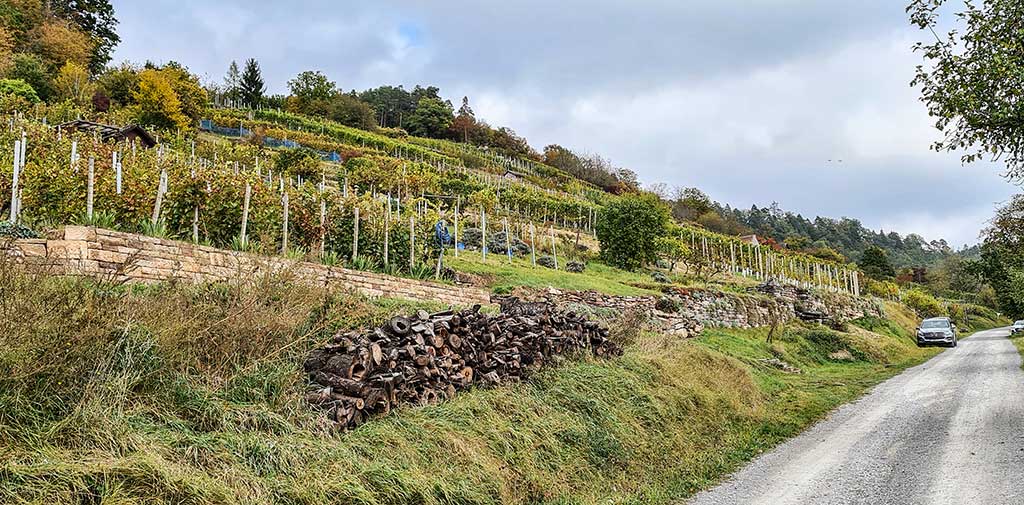 Ich bin mit Uli und Nicola Frizlen und Claudia Schmucker verabredet. Die drei sind mir im Mai beim Wandern auf dem HW 5 aufgefallen. Damals hatten sie spontan einen Tisch am Wanderweg aufgestellt und ihren Wein vorgestellt. Leider hatte ich keine Zeit, mich länger mit ihnen zu unterhalten. Doch sie hatten meine Neugier geweckt. Ich möchte wissen, wie ein Micro-Winzer tickt und arbeitet. Und so ein Lesewochenende im Herbst eignet sich prächtig dazu.