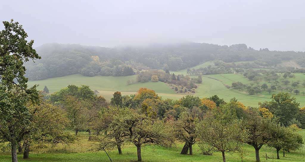Doch vorher ist es Zeit für eine Kaffeepause. Butterbrezeln, Pflaumen- und Schokoladenkuchen werden aufgetischt. Alle langen zu, denn wer seit 9 Uhr im Weinberg liest, ist hungrig. Die Sonne gewinnt für einen Moment den Kampf gegen den Nebel und taucht das Ammertal in goldenes Licht. Die Szenerie mit der versammelten Lesemannschaft am gedeckten Tisch sieht sehr idyllisch aus, perfekt wie ein Titelfoto für die Landlust.
