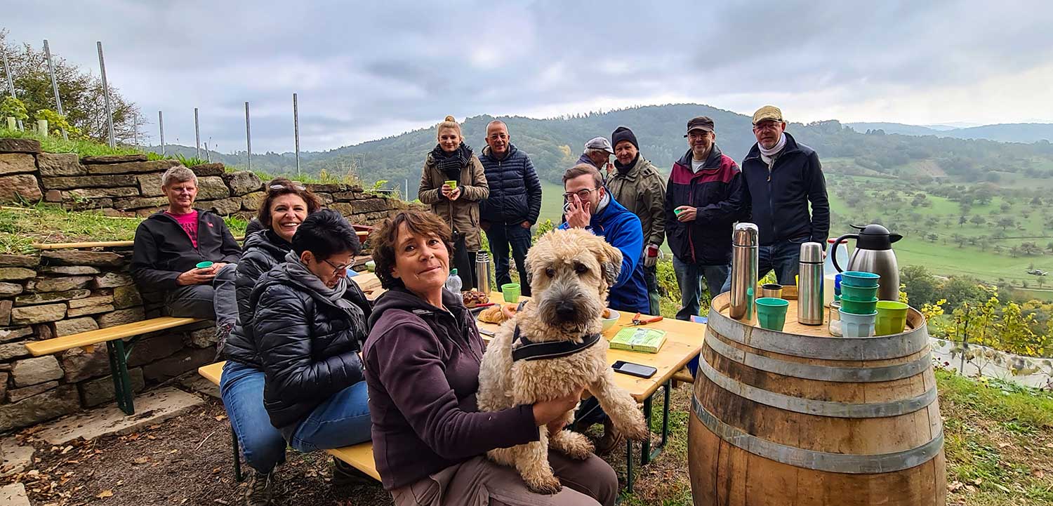Das Klischee des Wochenendwinzers mit fröhlicher Tafelrunde trügt. Die Lese ist nur ein Teil der Arbeit oder die „Kür“, wie Claudia sie nennt. Der Weinberg verlangt das ganze Jahr über Aufmerksamkeit: Rebstöcke wollen geschnitten, gebogen und gebunden werden, der Boden gehackt und begrünt, die Mauern und Treppen ausgebessert und instandgesetzt. Und das alles in der Steillage, wo Maschinen nicht eingesetzt werden können. Die „Freizeitwinzer“ nehmen sie die Herausforderung ernst, probieren Neues aus und wollen sich stetig verbessern. Seit über 15 Jahren arbeiten sie zusammen. Claudia hat sich das nötige Fachwissen bei einer Ausbildung zur Weinakademikerin angeeignet und sich seit letztem Jahr komplett dem Weinberg verschrieben. Uli und Nicola arbeiten weiterhin als Wirtschaftsprüfer und Architektin. Und wenn die drei einmal nicht weiterwissen, holen sie sich fachmännischen Rat bei einem befreundeten Winzer im Remstal. Trotz aller Mühen, die in dem Weinberg steckt, für sie ist er eine Kraftquelle, die ihnen viel gibt.