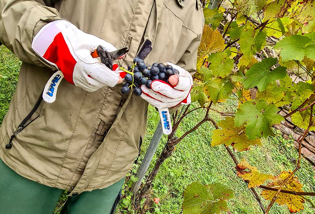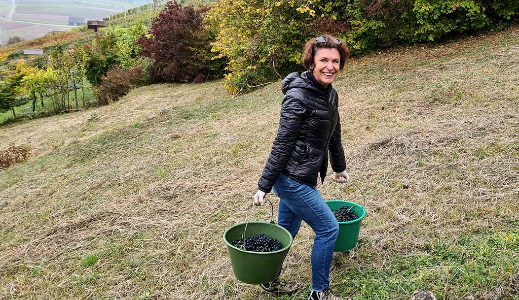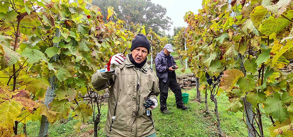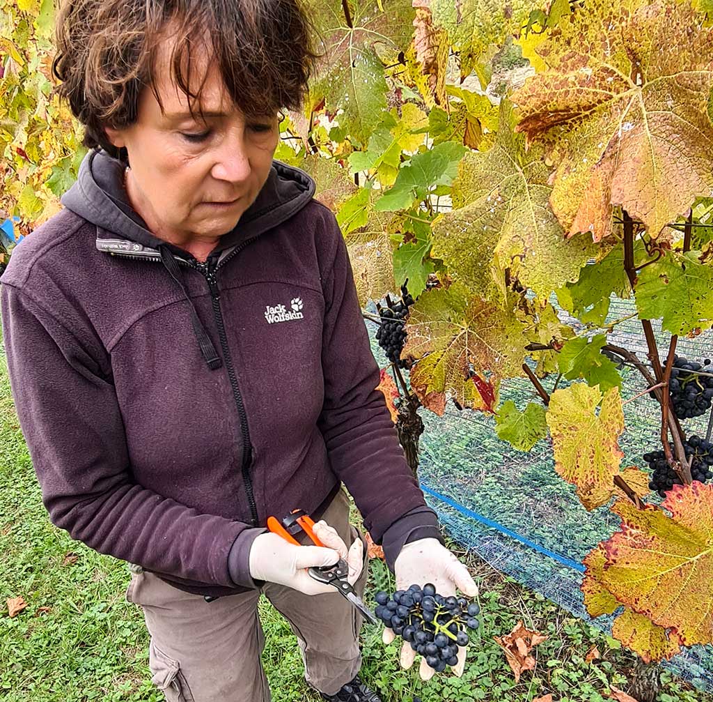 „Wir lesen heute sechs Gräben Prior und 3 Gräben Merlot.“ Claudia Schmucker ist eine zierliche Sechzigerin, die jünger wirkt und sich auch jünger fühlt.