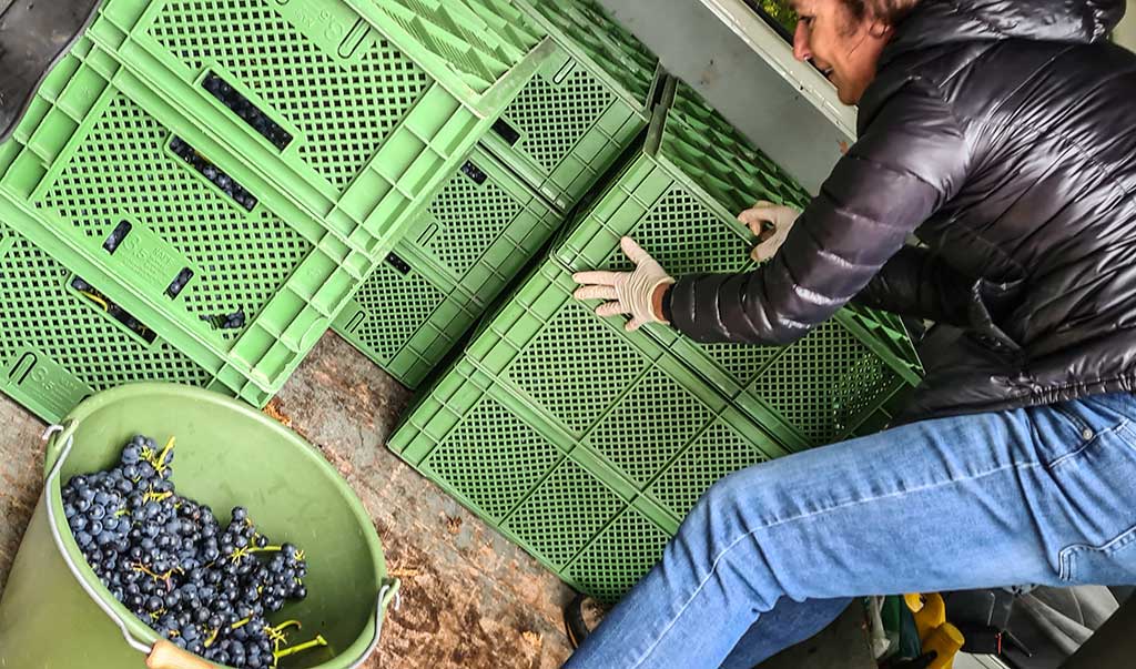 Ich begleite Nicola mit den gefüllten Eimern zum Transporter. Dort schichtet und stapelt sie die Trauben in flache Kisten. Claudias Mann übernimmt heute den Transport zum Weingut.
