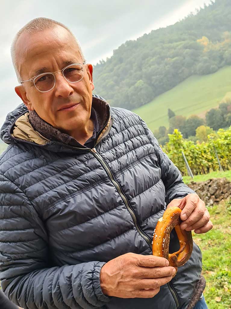 Mit der heutigen Ernte sind sie zufrieden. Weil es in Ammerbuch keine Genossenschaft gibt, erfolgt die Kellerwirtschaft im eigenen Betrieb. „Wir bauen unsere Weine sehr behutsam in Barriquefässern in einem Keller aus dem 17. Jahrhundert aus“, berichtet Uli. 90 Prozent der Kellerarbeit bestehe aus Putzen, zehn Prozent aus Nichtstun. Und mit der Butterbrezel in der Hand erklärt er mir noch, dass die Hefe der Brezel nicht mit den Trauben in Berührung kommen darf. Das würde einen unkontrollierten Gärungsprozess in Gang setzen. „An Versuche mit natürlichen Hefen aus dem Weinberg, der sogenannten Spontanvergärung haben wir uns (noch) nicht herangetraut, dazu sind wir zu klein.“