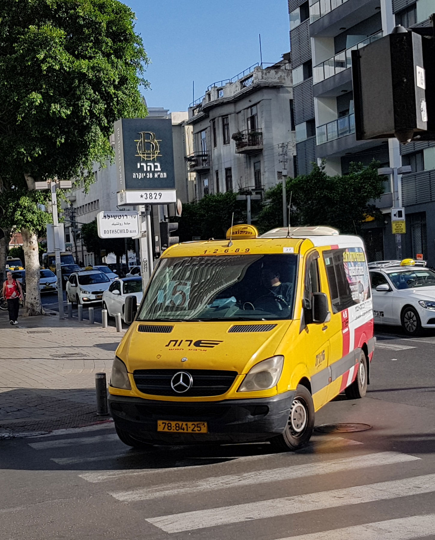 Die wichtigsten Buslinien werden zusätzlich von Sammeltaxen (6-12 Personen) befahren. Die gelben Minibusse (hebr. Monit Sherut) haben den Vorteil, dass du überall entlang der Strecke ein- und aussteigen kannst (Handzeichen) und nicht auf die vorgegebenen Bushaltestellen angewiesen ist. Außerdem fahren sie auch am Shabbat und sind günstiger als Taxis.