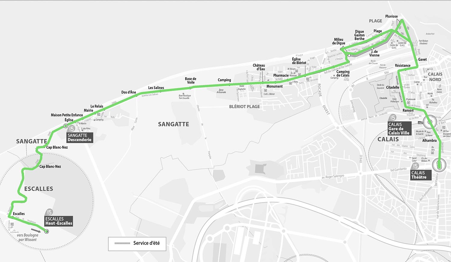 | Stationen | Theater, Rathaus, Bahnhof, Hafen, Calais Strand, Bleriot Strand, Sangatte, Cap Blanc-Nez, Escalles | ||
