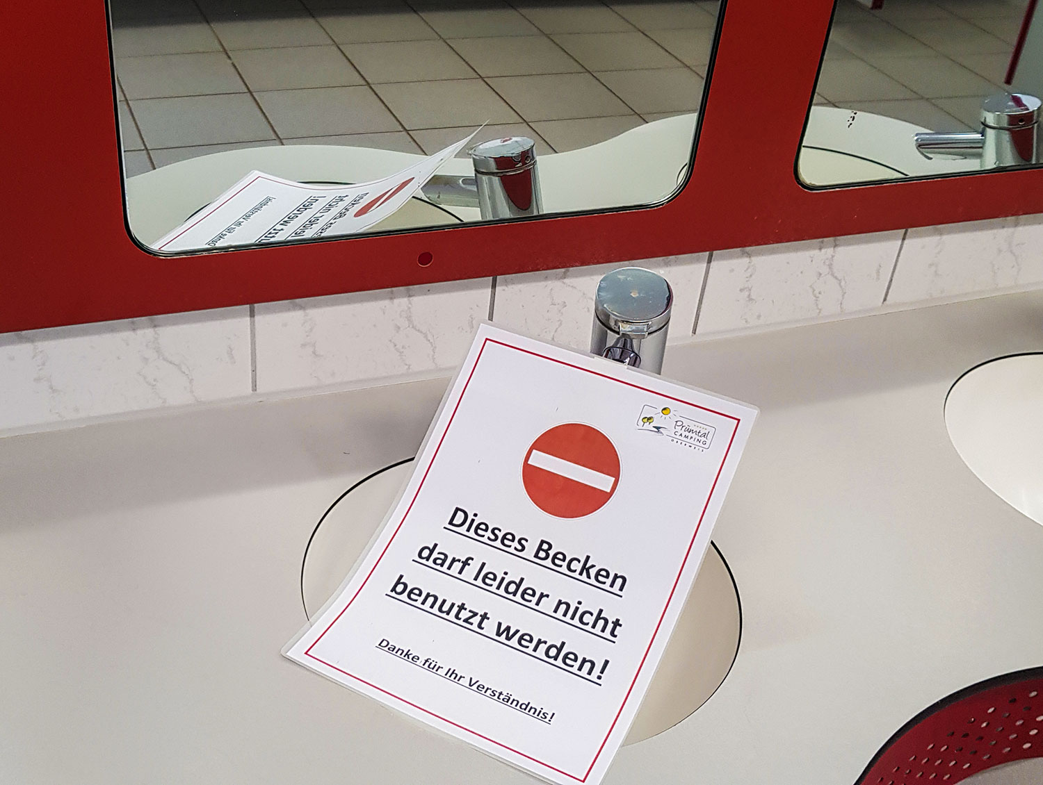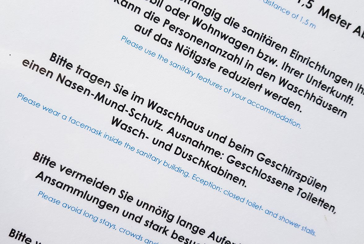 Kein Besuch der Toilette und der Dusche ohne Maske, egal wie spät und wie leer. Auch an der Rezeption, beim Schlange stehen am Kiosk und bis zum Platz im Restaurant ist das Tragen einer Alltagsmaske Pflicht. - Möglichst wenig öffentlich duschen, eigene sanitäre Anlagen nutzen