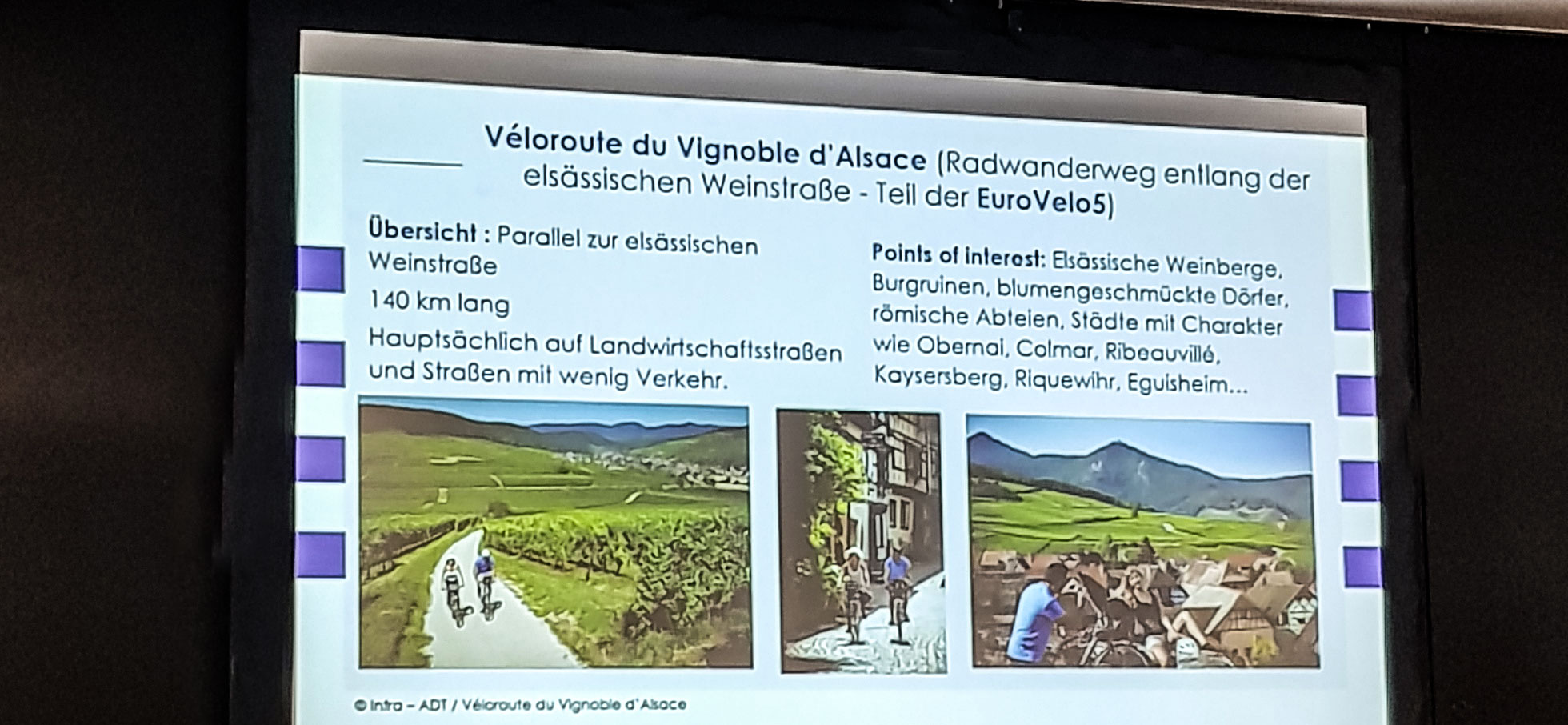 Auch die Pressekonferenz von Frankreich Tourismus widmet sich dem Radfahren. Ich erfahre, dass quer durch das Elsass die Eurovélo-Route 5 verläuft. Burgruinen, malerische Dörfer und zahlreiche Weingüter säumen die 140 Kilometer lange Strecke. Das ist doch herrlich. Man hat wunderschöne Landschaften vor Augen und kann immer wieder mal ein Stopp einlegen, Wein trinken und schlemmen. Wetten, dass im Elsass das Genussradeln erfunden wurde?