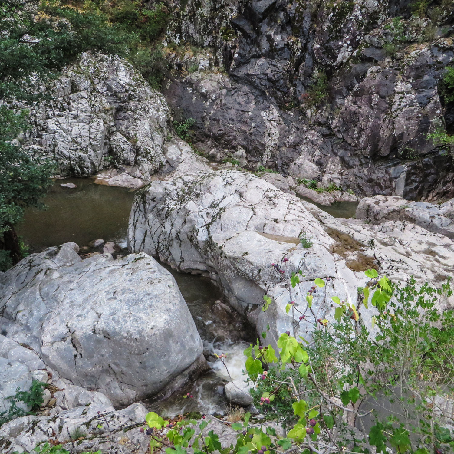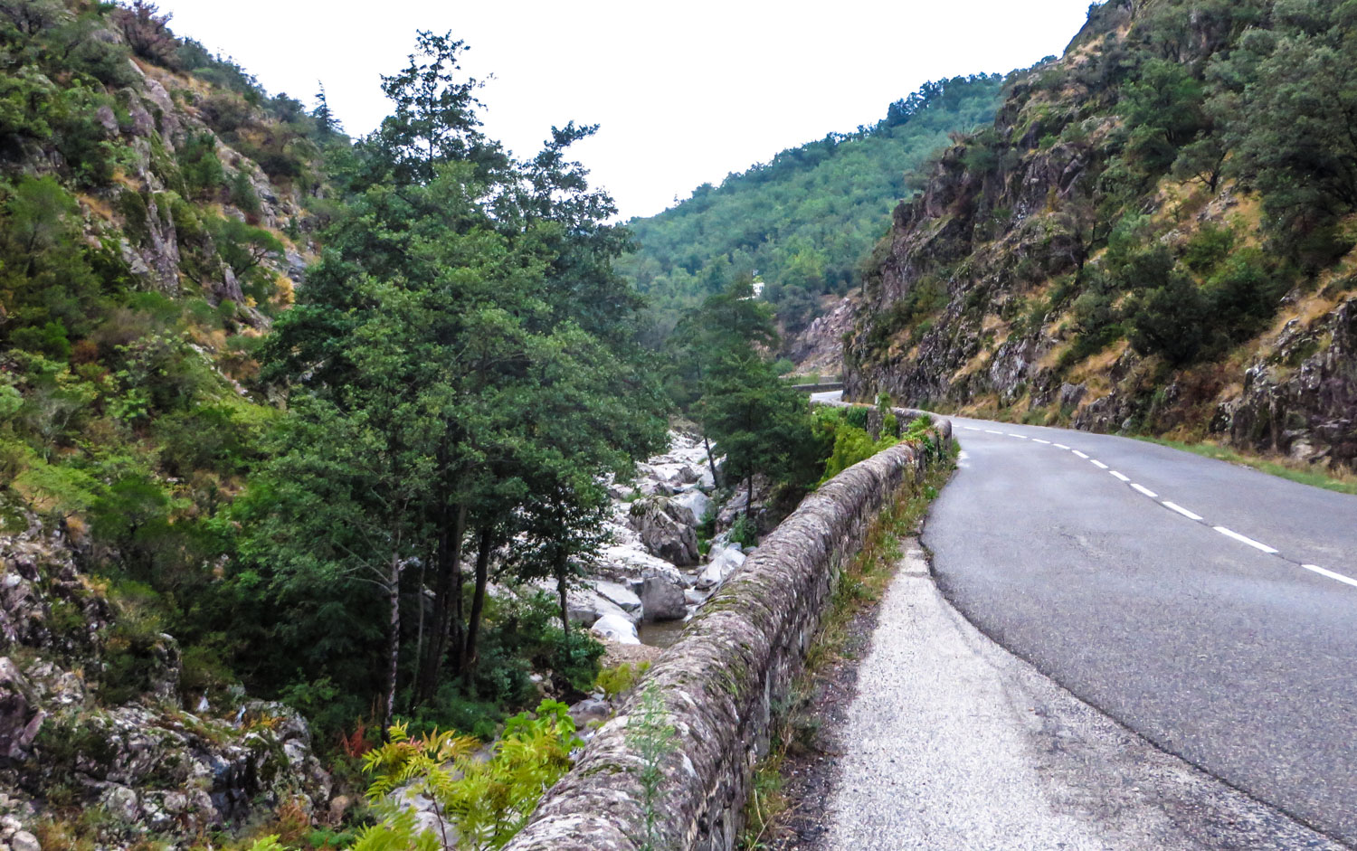 Zwischen Pont-de-Labeaume und Jaujac verläuft die Straße immer wieder mal direkt am Fluss Lignon. Der entspringt in den Cevennen und fließt bei Jaujac durch enge, vulkanisch geprägte Basaltschluchten.