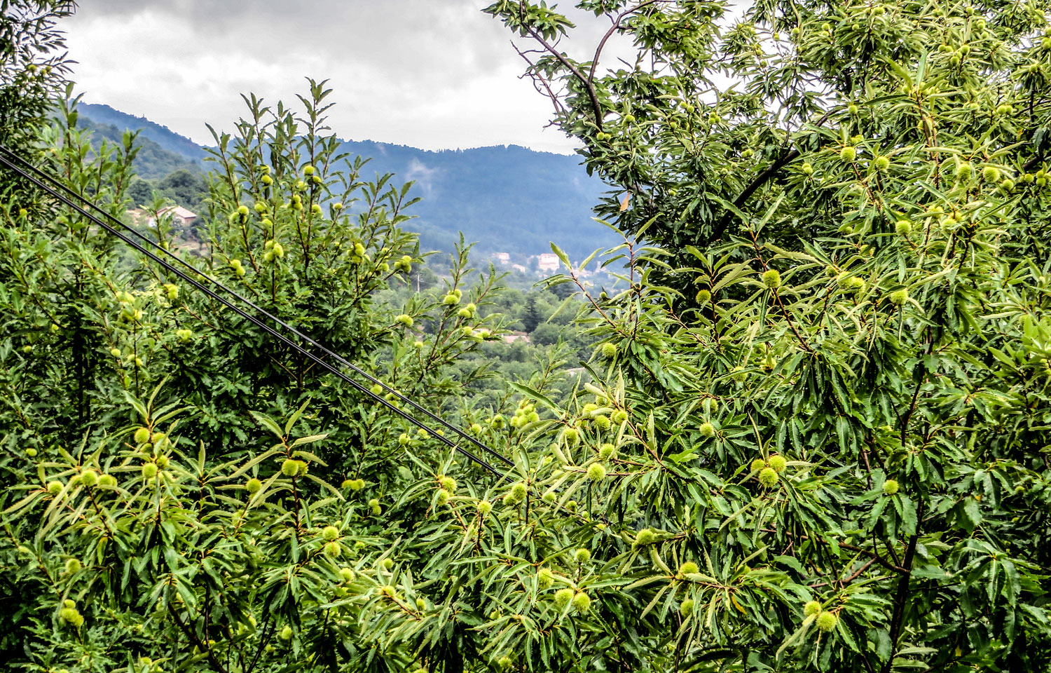 Nachdem du den Gipfel passiert hast, geht es wieder bergab. Richtung Prunet säumen Kastanienwälder die Straße. Die Esskastanie ist DAS Wahrzeichen des Départements Ardèche. Es ist das größte Anbaugebiet für Kastanien in Frankreich, mit einer Produktion von annähernd 5.000 Tonnen pro Jahr. Aus der Esskastanie werden Süßwaren, Crème de marrons, Likör, Kuchen, Bier, Suppe und Brot hergestellt.