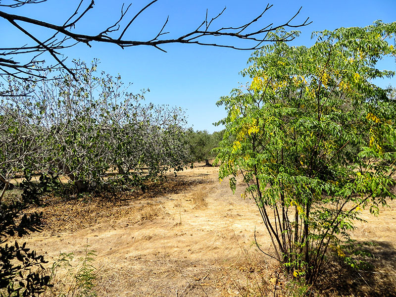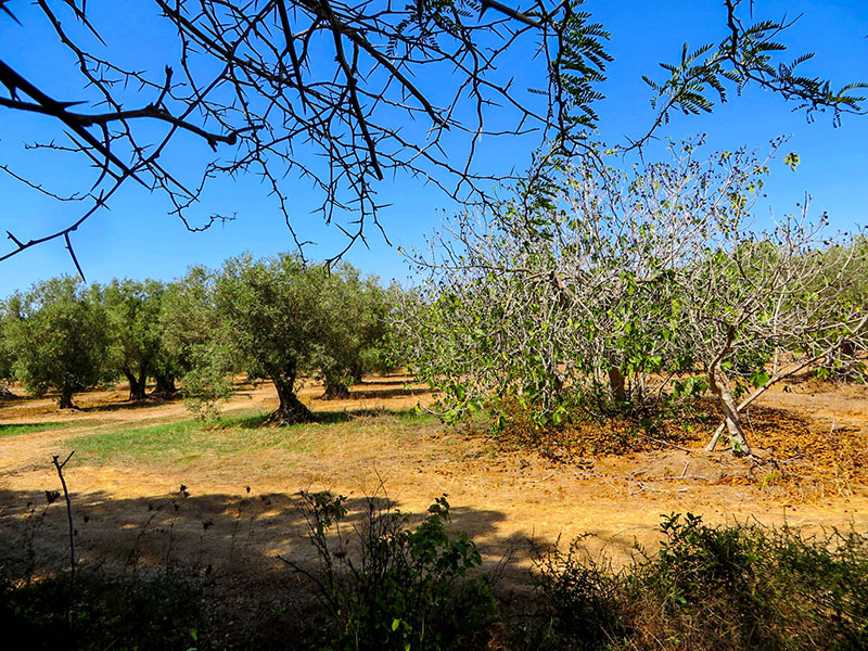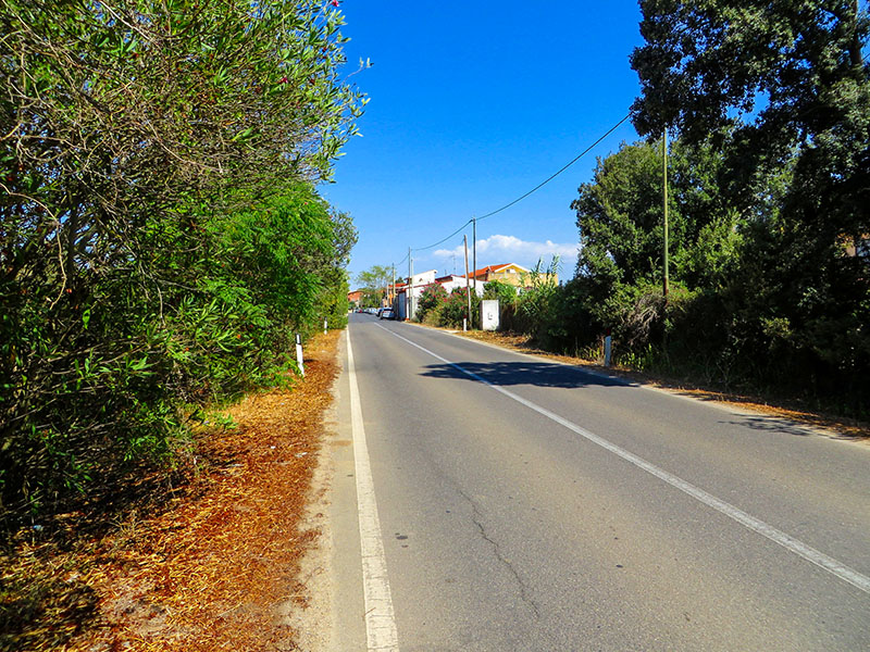 Schnell ist der Ort durchfahren, jetzt säumen Hecken und Schilf die Straße. Vom Auto aus ist nichts zu sehen. Ich steige aus und werfe einen Blick durch die Büsche. Landwirtschaft prägt die Gegend. Auf der einen Seite gibt´s junge und alte Olivenhaine, auf der anderen Straßenseite wird Wein angebaut. Wir fahren weiter… und schon kommt der nächste Ort: Donigala Fenughedu. Die SP 5 geht jetzt in die Via Cabras über und endet kurz hinterm Postamt.