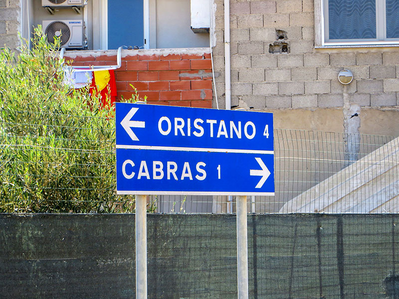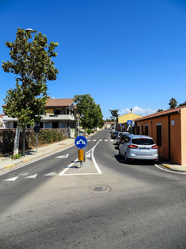 Unsere Erkundung startet am Kreisverkehr mit Palme in Solanas, einem Vorort von Cabras mit knapp 1.000 Einwohnern. Die Häuser entlang der Straße sind niedrig, ihre Fassaden leuchten ockergelb, himbeerrot und orange. Doch es ist totenstill, kein Mensch ist auf der Straße, alle Fensterläden sind geschlossen, Klar, ist es doch sengend heiß, und wahrscheinlich halten alle Einheimischen Siesta.