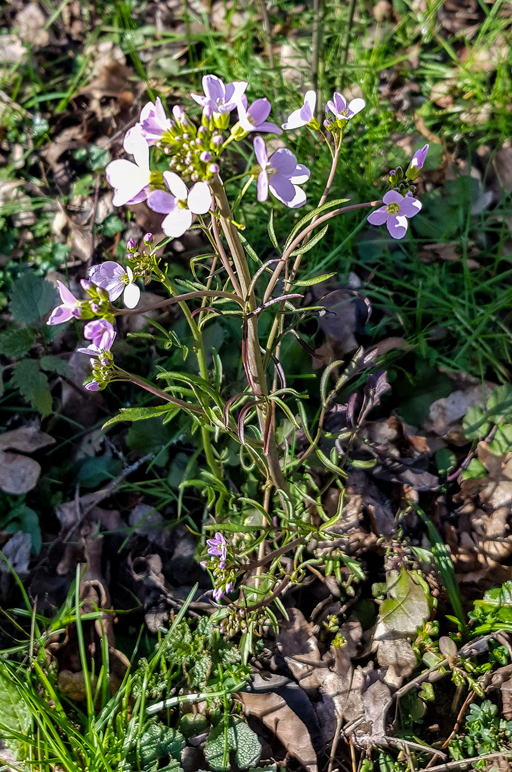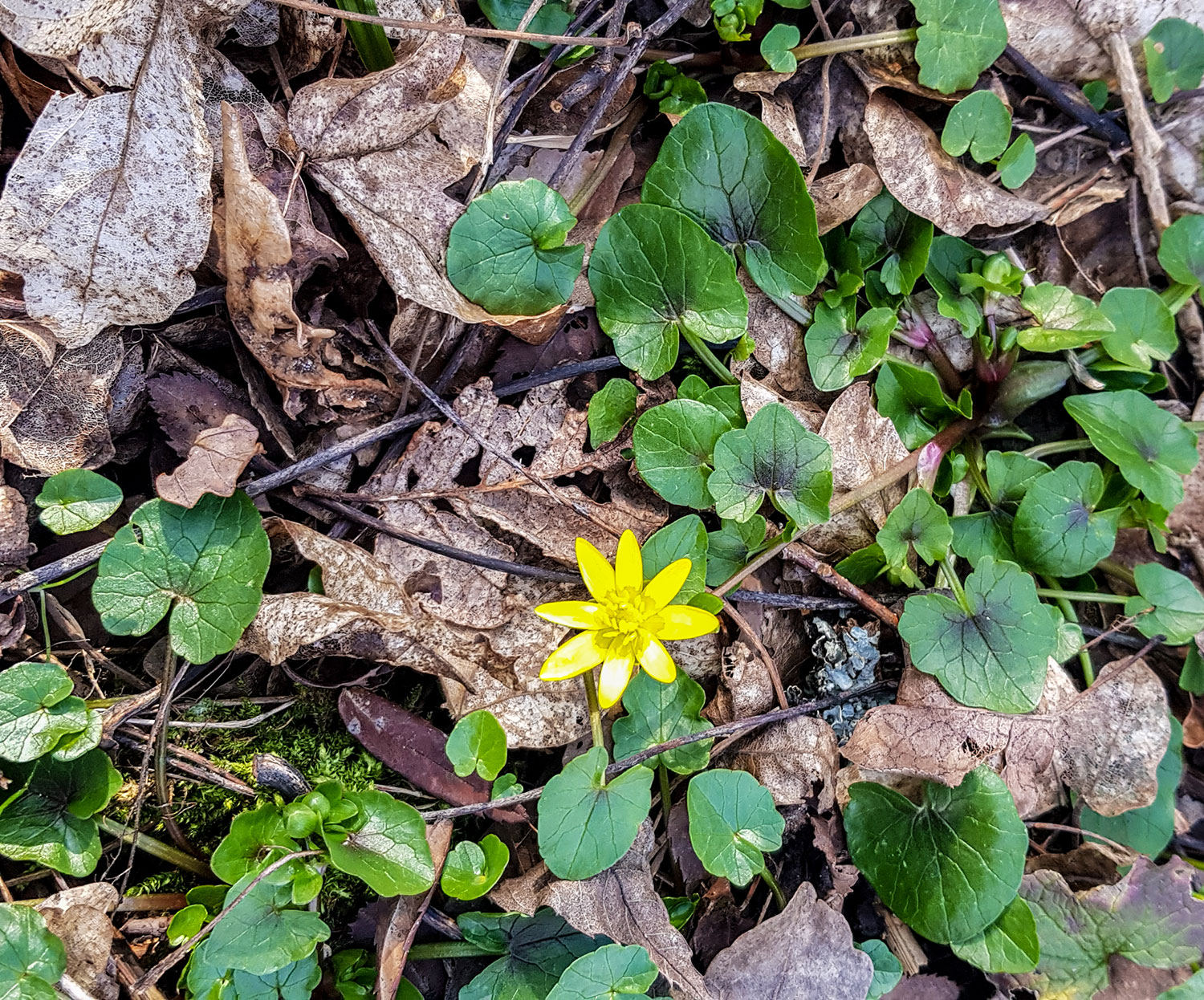 Gelb und fröhlich leuchten Huflattich und Scharbockskraut. Ganz zart ist dagegen das Lila des Wiesenschaumkrauts.