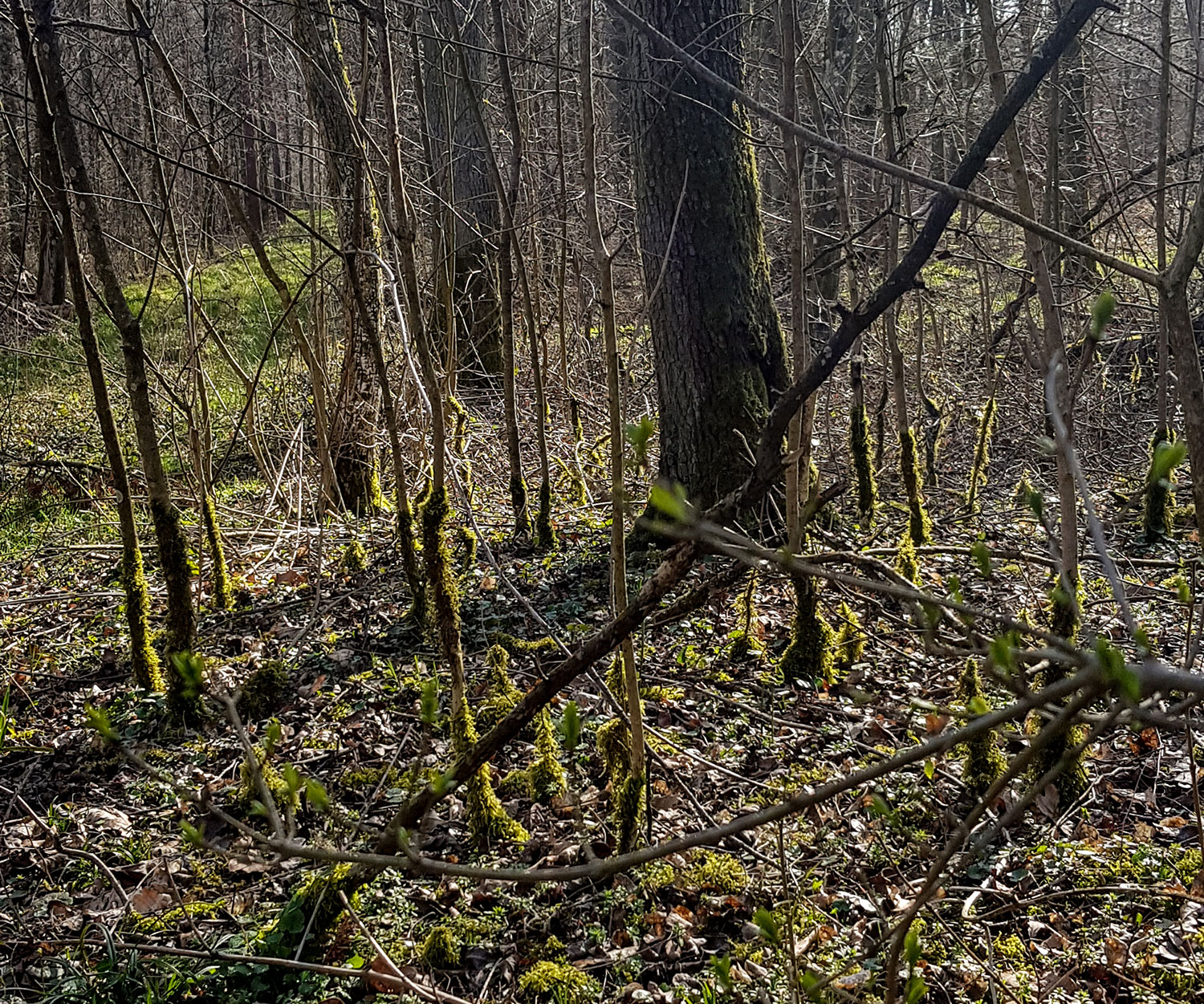 Im Bannwald soll sich der Wald ungestört zum „Urwald von morgen“ entwickeln. Es sieht herrlich unordentlich aus. Die meisten Bäume sind noch kahl, doch hier und da sprießt im Unterholz erste Gräser.