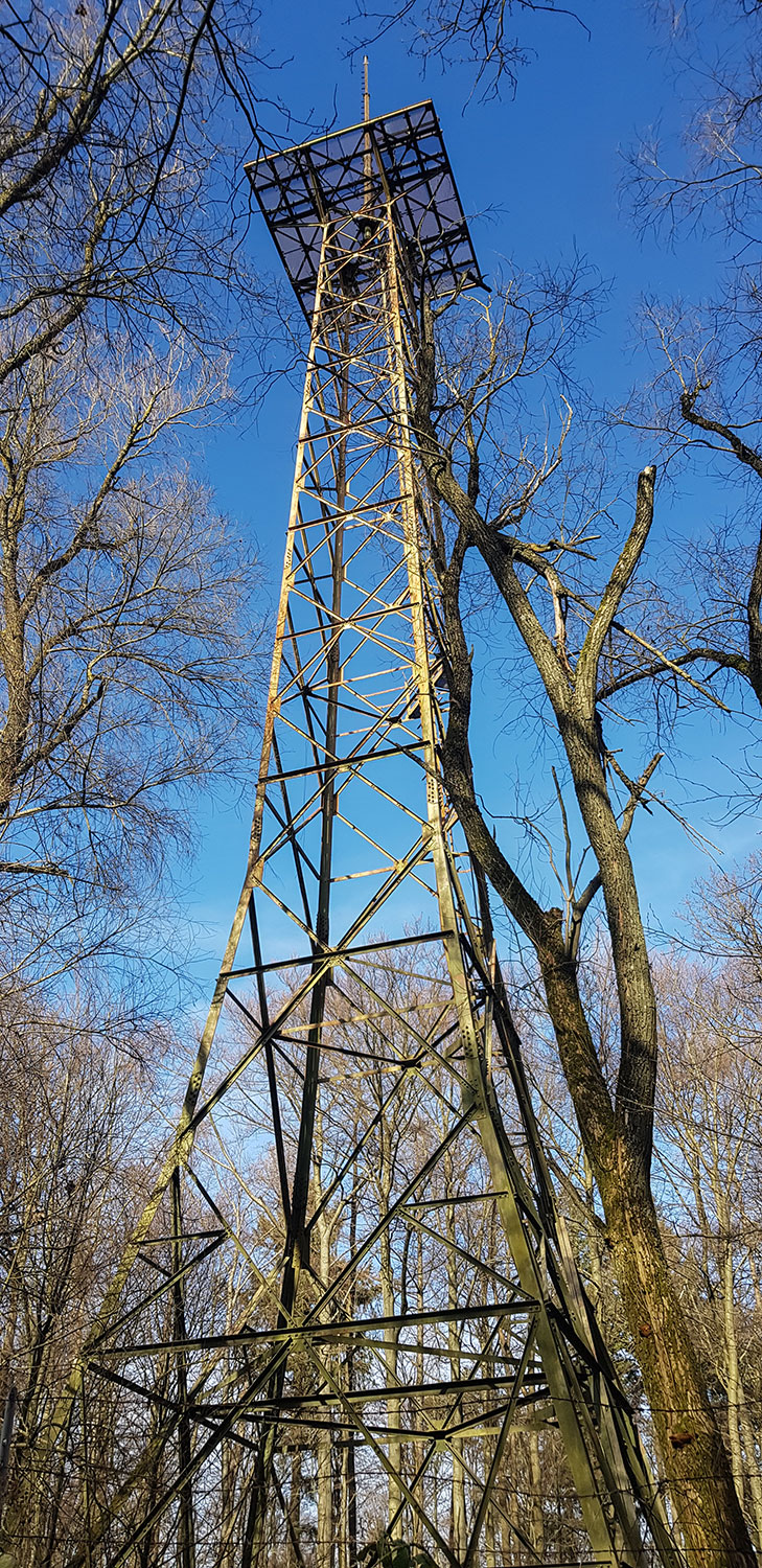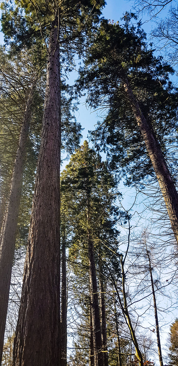 Der Wanderweg SH5 verläuft ein Stück auf dem HW 10 und führt an einer kleinen Gruppe von Mammutbäumen vorbei. Eine Infotafel erklärt, warum es die Bäume aus der Sierra Nevada im 19. Jahrhundert hierher verschlagen hat. Dann entdecke ich noch eine Buche mit einer ausladenden Krone entdeckt und ja, …das ist ein maroder Fernmeldeturm.