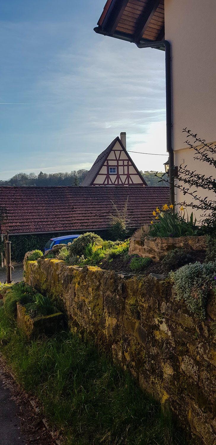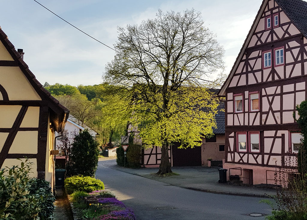 Das letzte Drittel des Weges läufst du über Wiesen und am Feldrand entlang bis hinunter nach Häfnerhaslach. Die Aussicht ins Kirbachtal ist wunderbar. Rechts weiden Lämmer und vor dir liegt eine typische Streuobstwiese. ‚Wenn die Apfelbäume blühen, komme ich wieder`, das nehme ich mir fest vor. Mein Wanderweg mit der Nr. 5 führt nicht bis in den Ortskern hinein, doch ein kleiner Abstecher lohnt allemal. Häfnerhaslach ist ein alter Töpferort mit schönen Fachwerkbauten und wenn die Besenwirtschaft „Am Rittersprung“ geöffnet hat, kannst du dort einkehren.