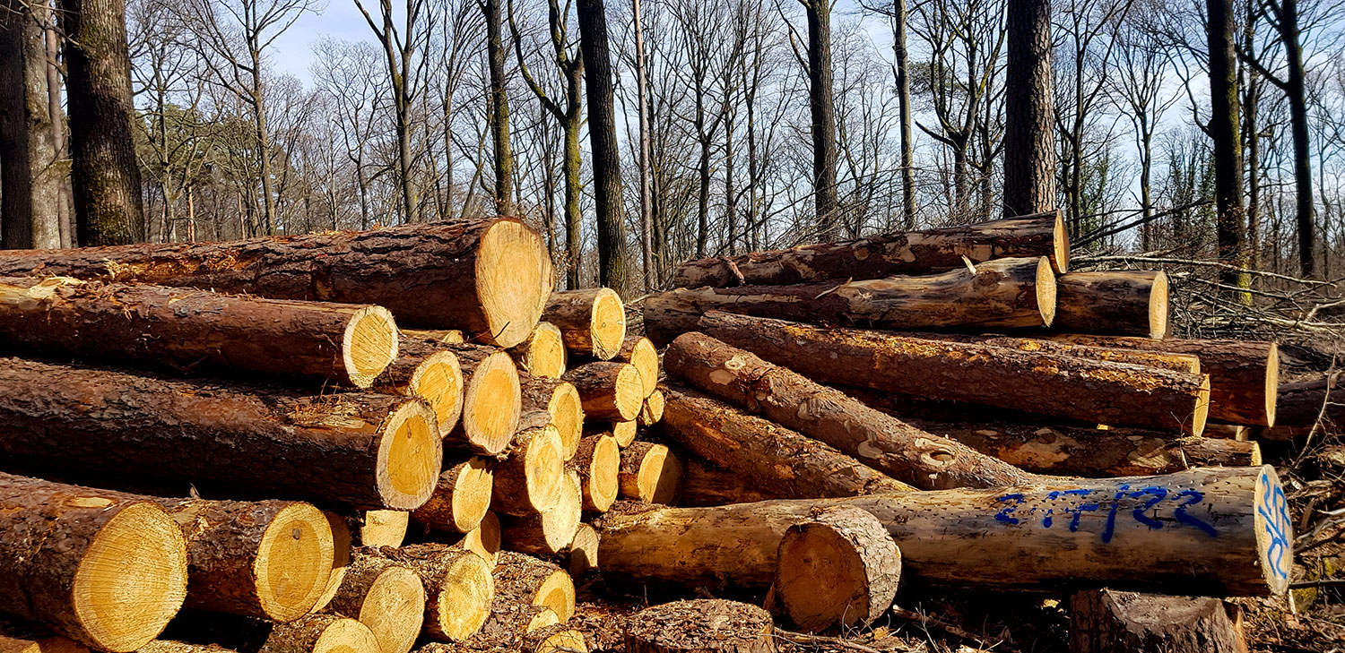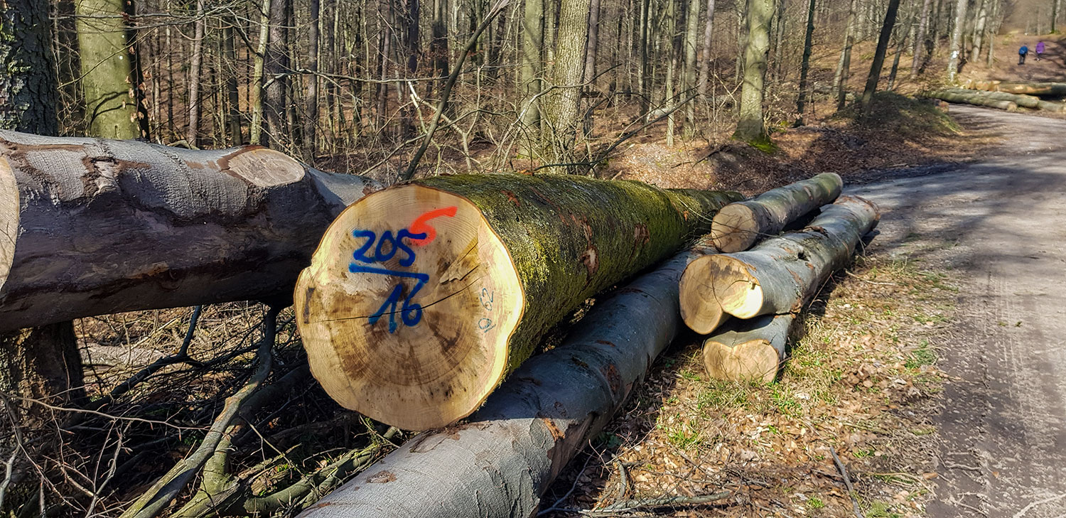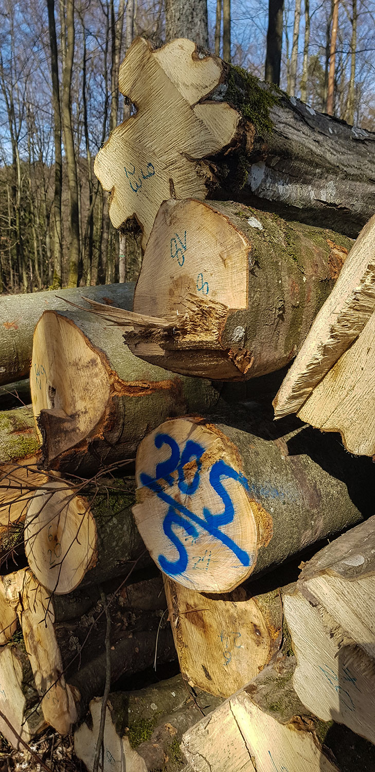 Rechts und links des Weges stapeln sich frisch geschlagene Buchen- und Eichenstämme. Die Forstarbeiter haben ganze Arbeit geleistet. Die mahnenden Worte meines Vaters im Ohr „Das ist gefährlich, die können rutschen…,“ widerstehe ich dem Drang, auf den Holzstapeln herumzuturnen. Intensiv riecht und duftet es nach Holz. Die Nummerierung auf den Stämmen ist mir ein Rätsel. Was bedeuten die blauen und roten Kringel, die Abkürzungen und Zahlen?
