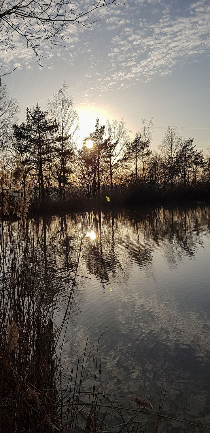 Bevor ich mich ins Auto setze und heimfahre, genieße ich noch einmal die Abendstimmung über den Heiligenbergsee. Und ich bin glücklich und zufrieden, dass ich einfach mal losgewandert bin.