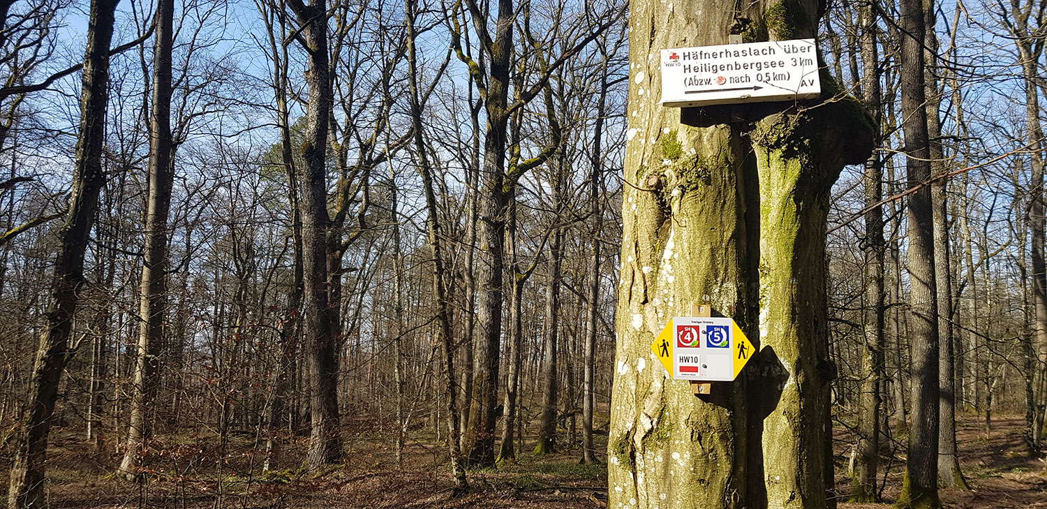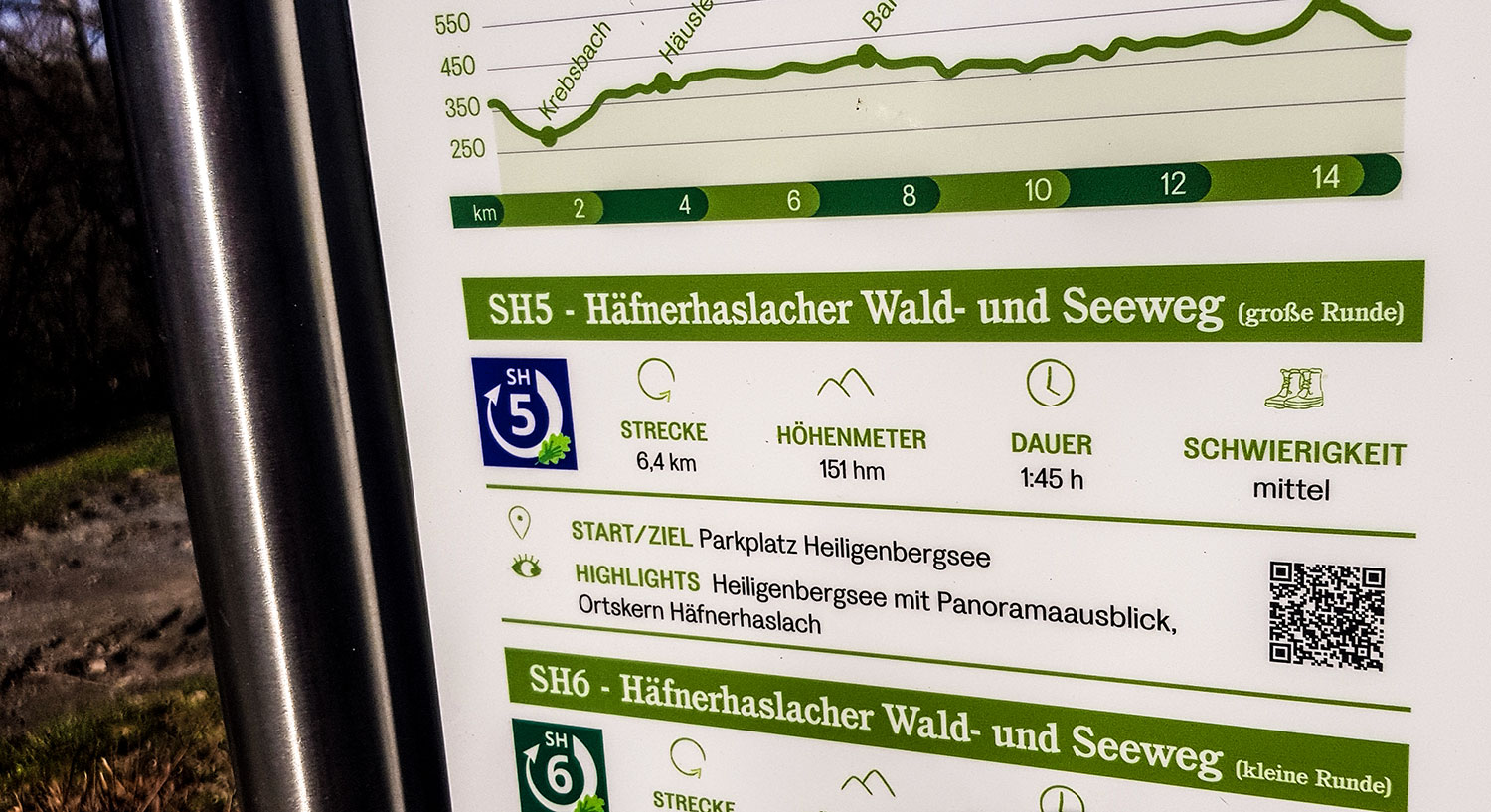 Auf der Informationstafel werden dir drei Wege vorgestellt: eine kleine, eine mittlere und eine große Runde. „Wanderdreiklang“ nennen es die Tourismusexperten vom „Land der 1000 Hügel“, die sich dieses Angebot ausgedacht haben. Ich entscheide mich für den SH5. Das ist die mittlere Runde des Häfnerhaslacher Wald- und Seen-Wegs. Sie ist 6,4 Kilometer lang und soll in knapp zwei Stunden machbar sein.