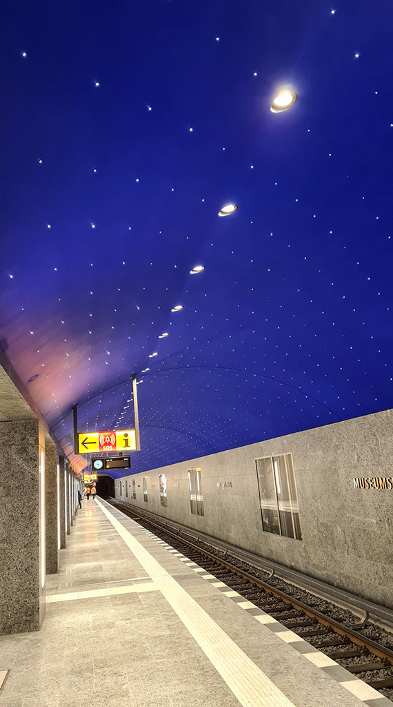 Auf der Museumsinsel kannst du locker einen ganzen Tag verbringen und dich den schönen Künsten hingeben. Doch schau dir zuerst noch die Decke der gleichnamigen U-Bahnstation an. Sie ist aquamarinblau und mit 6.600 LED-Lichtern bestückt. So sieht er also aus, der Himmel unter Berlin. Nahezu jeder zückt jetzt zum Smartphone…