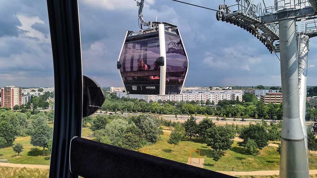 | Schöne Aussicht: | Berliner Dom, Fernsehturm, Hotel Park Inn, Kienberg Aussichtskanzel und aus der Seilbahn-Gondel | ||