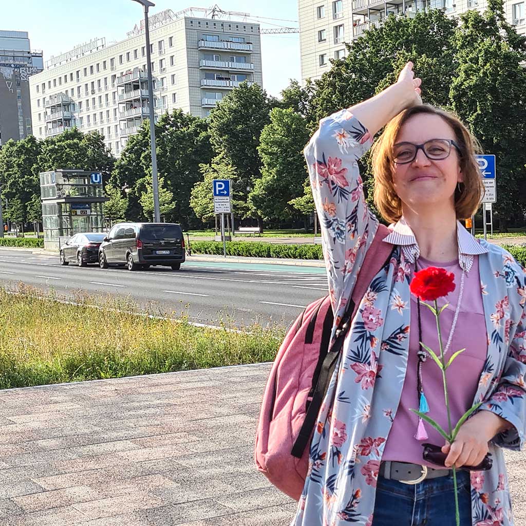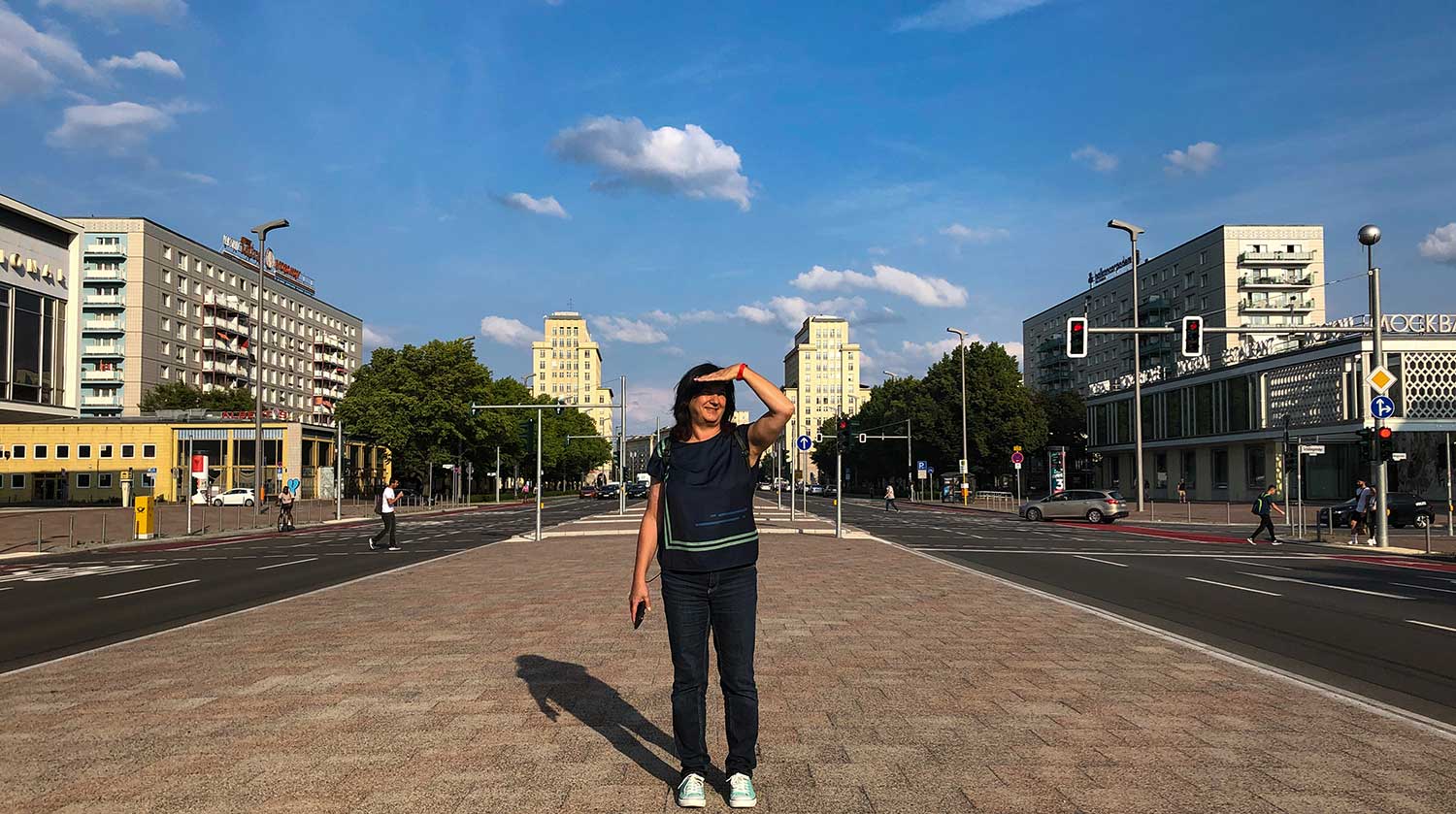 Am 1. Mai und zum DDR-Geburtstag im Oktober fanden auf der Karl-Marx-Allee immer die Aufmärsche und Militärparaden statt. Doreen zeigt mir den Pioniergruß. Unter der Straße verläuft die alte Kernstrecke der U5 mit Bahnhöfen, deren Fliesen jeweils eine andere Farbe haben: Rot, gelb, blau, grün gaben schon in den 1930er-Jahren den Fahrgästen Orientierung. Ein schönes Café mit viel Geschichte ist das Café Sybille nahe dem U-Bahnhof Weberwiese, und am Frankfurter Tor habe ich sehr lecker vietnamesisch gegessen.