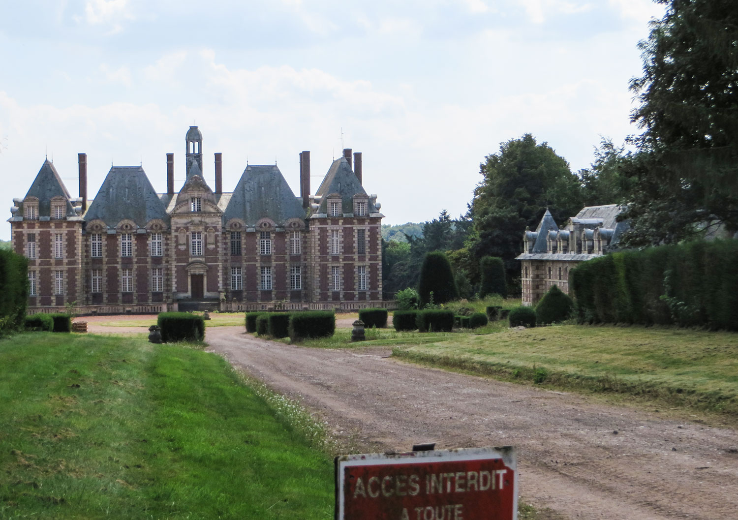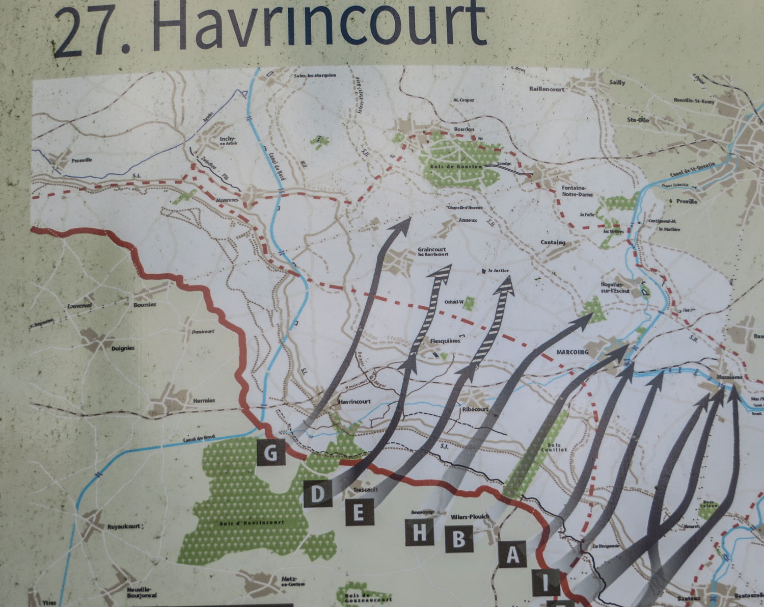 Und dann endet die D5 am Kreisel in Havrincourt. Es sind nur ein paar Schritte bis zum Schloss, doch der Zutritt wird einem verwehr1: Acces inderdit steht auf dem Schild. Auch bei Google ist nicht viel über das Schloss zu finden, wahrscheinlich ist es in Privatbesitz. Ich stoße auf einige Einträge aus Kriegstagebüchern aus dem Ersten Weltkrieg: „Schloss Havrincourt zerstört, Brücke am Kanal zerstört…“ oder „12. September 1918: Cambrai – Schlacht um die Hindenburg-Linie beginnt: Die Schlacht von Havrincourt wird auf einem 8 km breiten Abschnitt durch 6 Divisionen von Byngs britischer Dritten Armee gewonnen..“ Am Zaun vor dem Schloss gibt es auch eine Infotafel über die Schlacht.