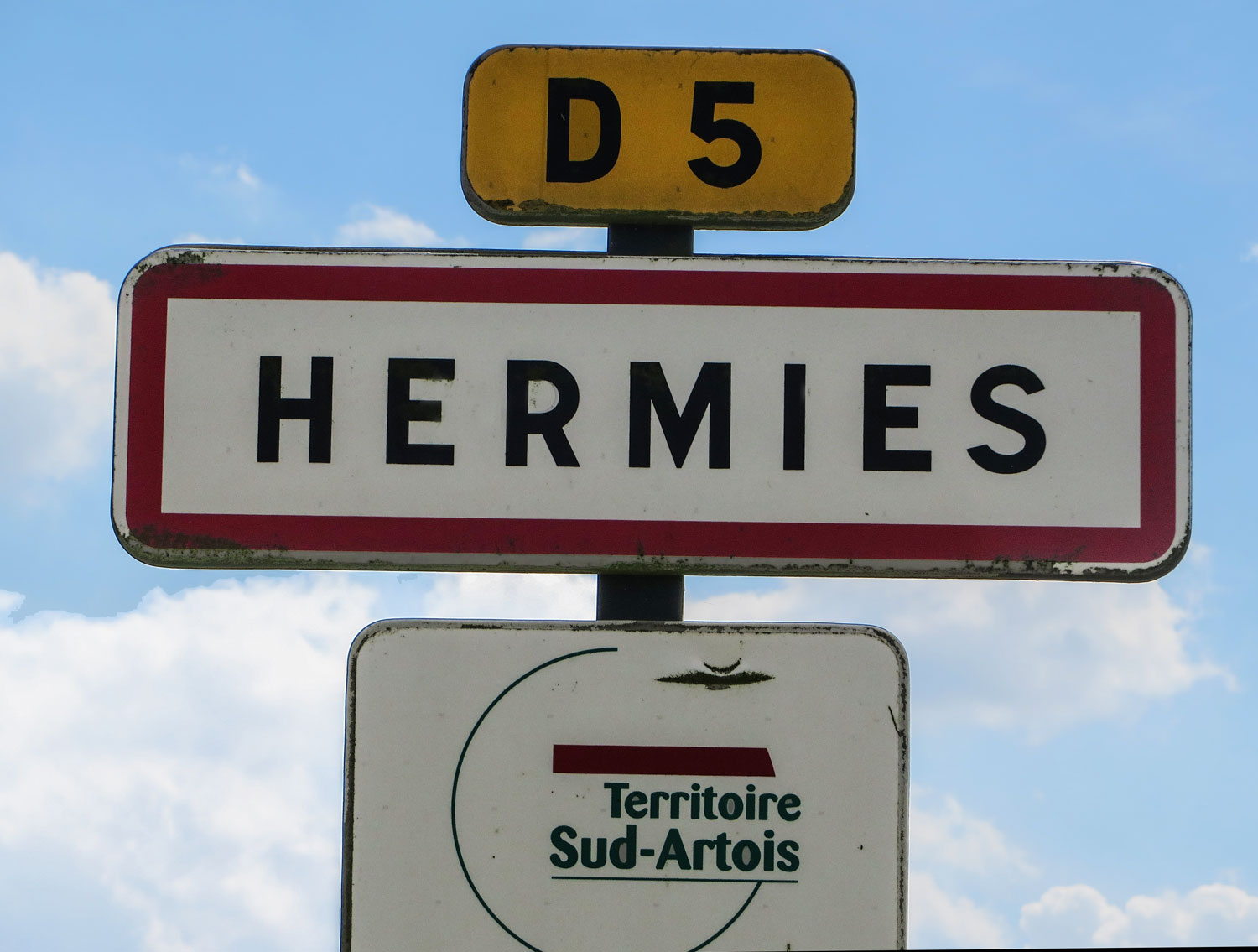 Eine kleine Kuriosität: Hinter Lagnicourt Marcel wird aus der D5 plötzlich die D34. Warum? Wir überqueren hier die Départementsgrenze und sind jetzt im Département Nord. Der Ort Doignies folgt und schon sind wir wieder im Département Pas-de-Calais und steuern – wieder auf der D5 – Hermies an.