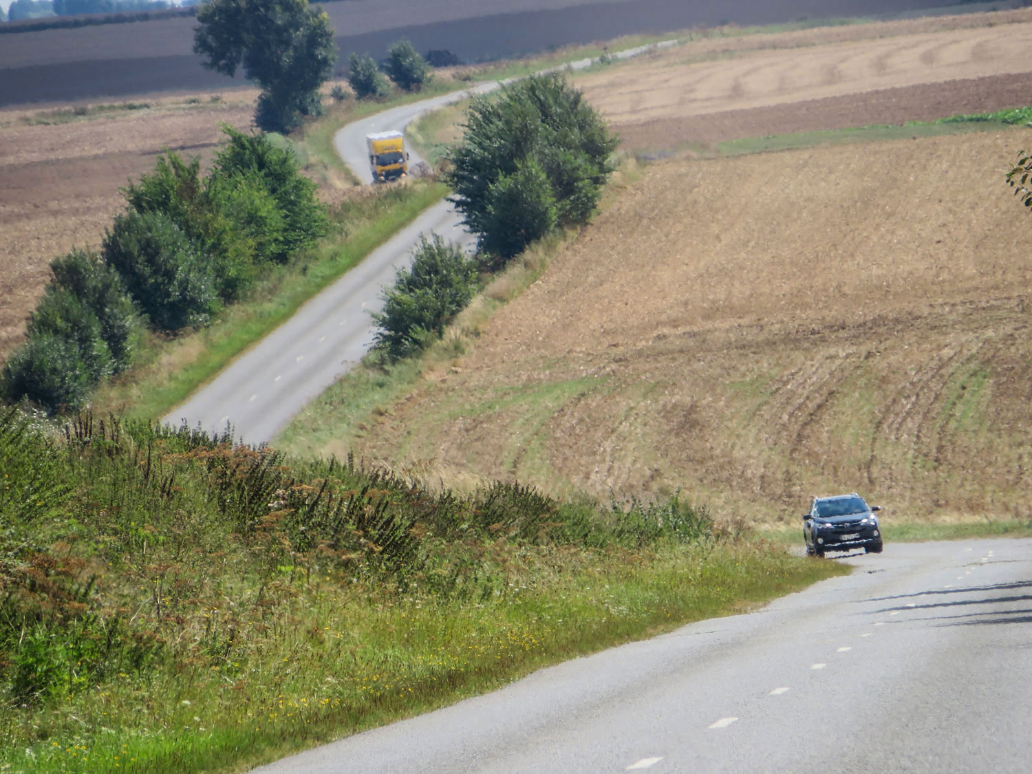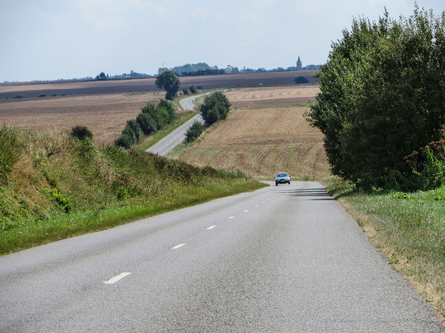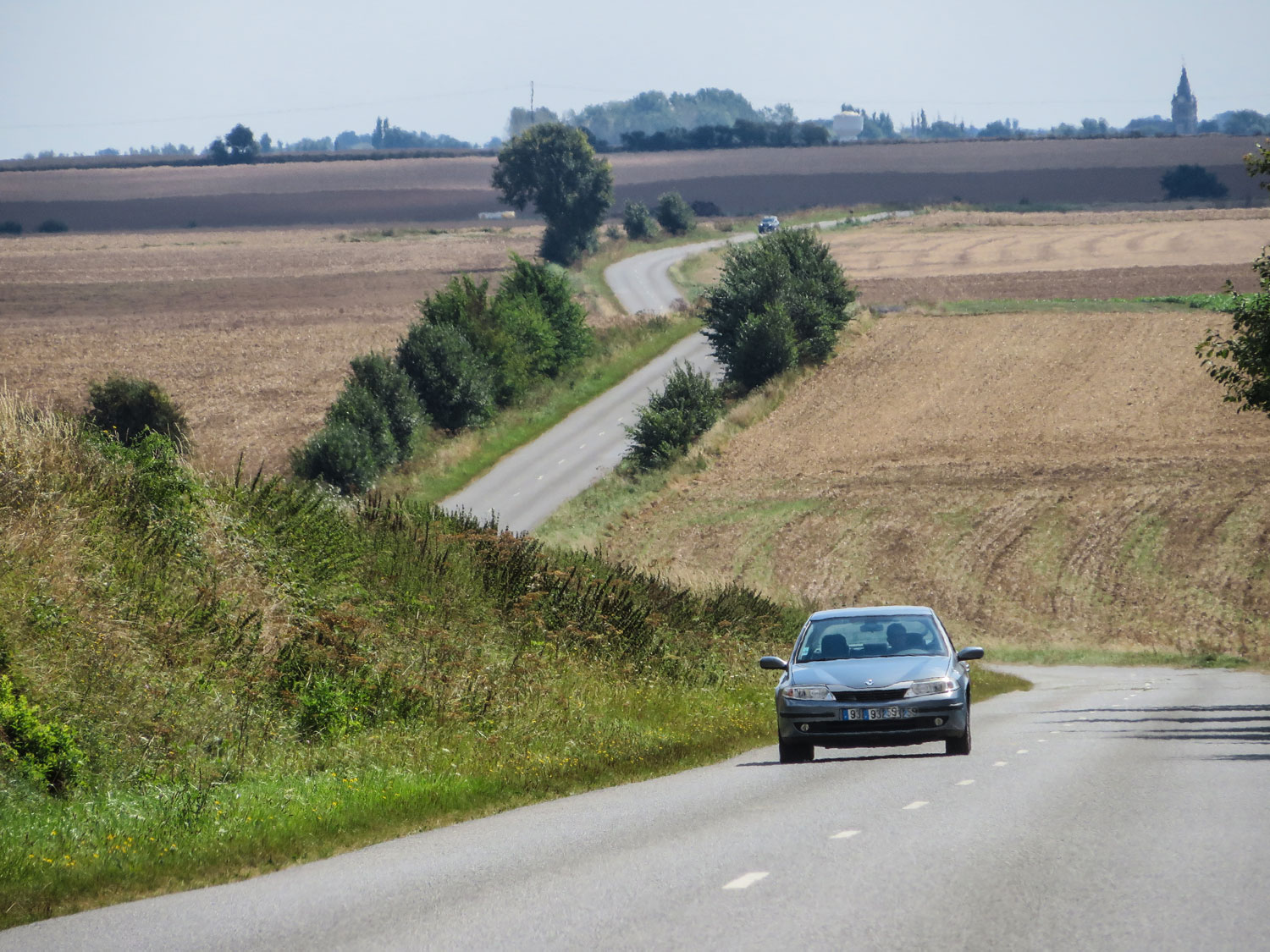 Hinter Croiselles liegt ein wunderschöner Abschnitt der D5. Kleine Hügel, ein sanftes Auf und Ab, die Straße läuft etwas versetzt wie im Zick-Zack-Kurs. Es ist Ende August, das Getreide ist abgeerntet und die ersten Äcker schon wieder umgepflügt. Dunst und Melancholie liegen über der Landschaft und verbreiten ihren ganz eigenen Reiz.