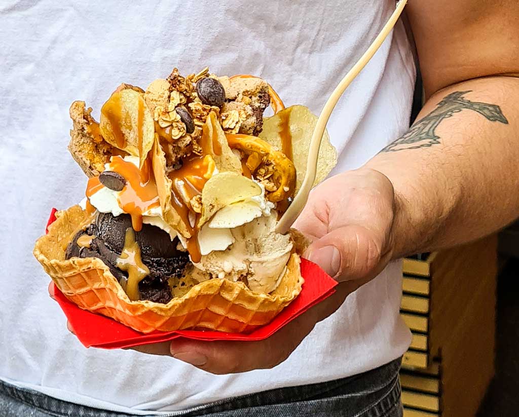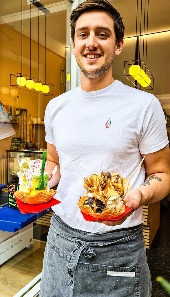 Neue Altstadt? Ja, die Frankfurter haben jahrelang gebohrt, gehämmert und gebaut und 15 alte Häuser originalgetreu rekonstruiert. Unter uns, mir sind die „Fake-Altbauten“ eine Spur zu glatt. Doch die Geschmäcker sind ja bekanntlich verschieden… Fahr mal hin und mach dir am besten selbst ein Bild. Und bestimmt legen die neuen „alten“ Fachwerkhäuser mit den Jahren noch etwas Patina an. Noch ein Tipp zum Verweilen, der nicht so touristisch ist, wie direkt am Römerberg oder Dom. Folge der Braubachstraße Richtung Main. Rund um das Fischerplätzchen sind nette Cafés, eine Bar und das neu eröffnete Eiscafé Pallina mit veganem Eis und ausgefallenen Kreationen wie dem Kompostbecher.