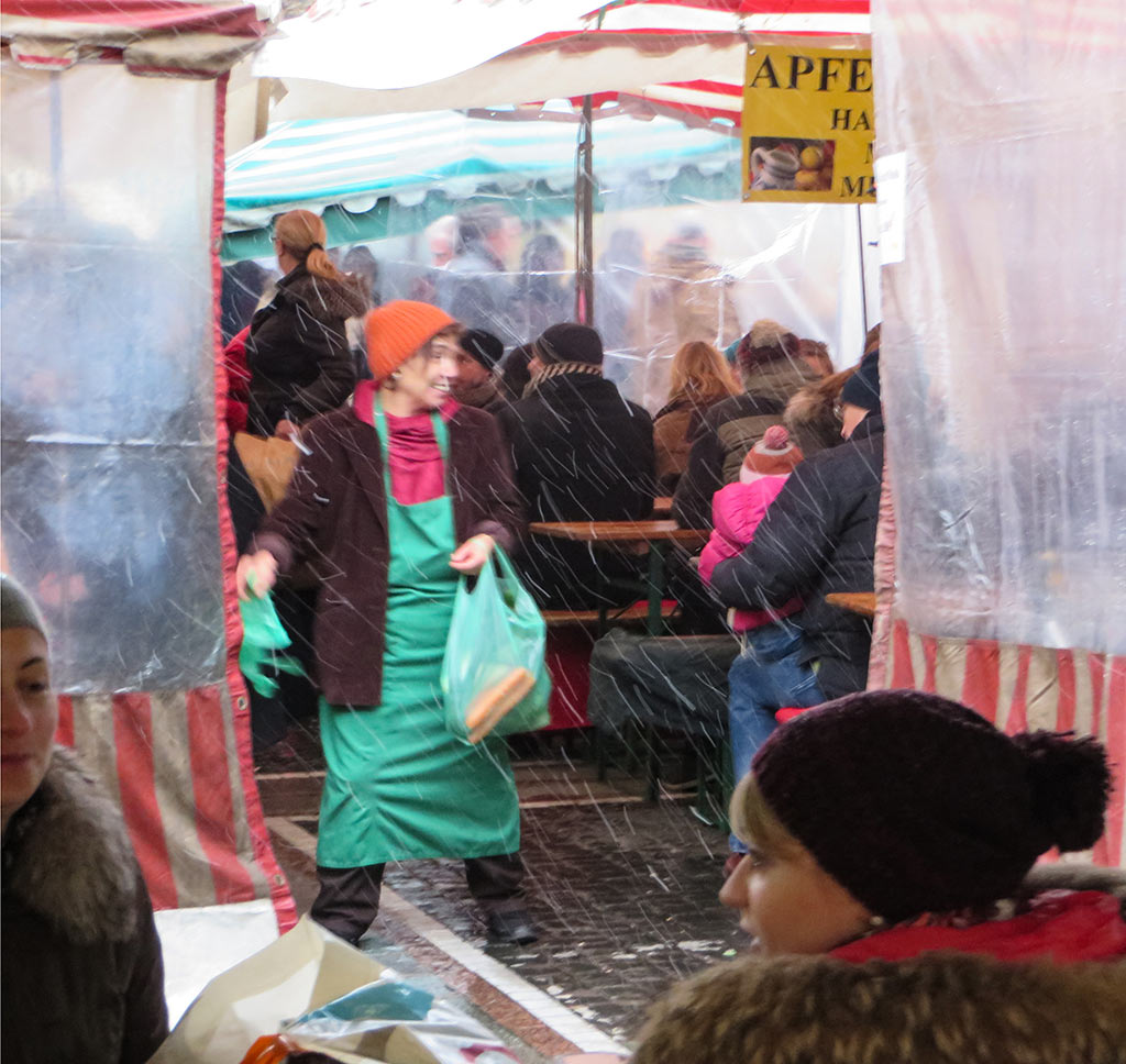 Sogar ungemütliches Winterwetter hält Hartgesottene nicht ab. Falls es dir dann doch zu sehr regnet, geh ein paar Schritte weiter bis zur Kleinmarkthalle…
