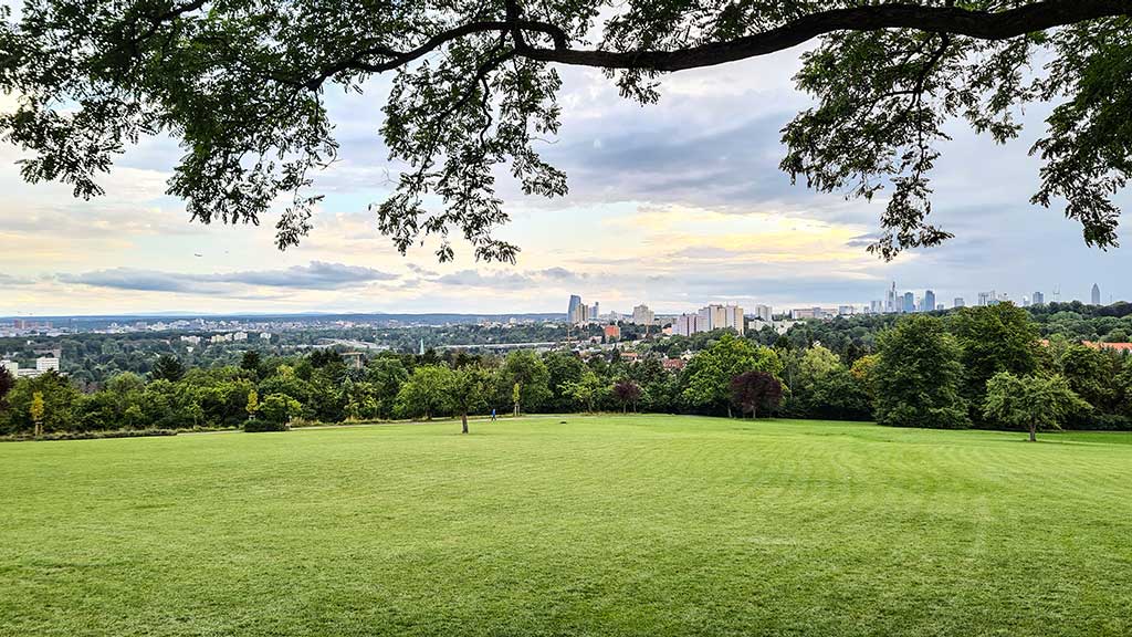 In der Nähe der Haltstelle ist eine Station von Call a Bike. Mein Tipp: Steig um aufs Rad und strample auf dem Grüngürtelradweg bis zum Lohrberg (185mNN) hinauf. Das ist der Hausberg von Frankfurt. Von dort hast du noch mal eine fantastische Sicht auf die Skyline von Frankfurt und kannst unter Apfelbäumen sitzen, etwas essen und trinken und deine Eindrücke Revue passieren lassen.