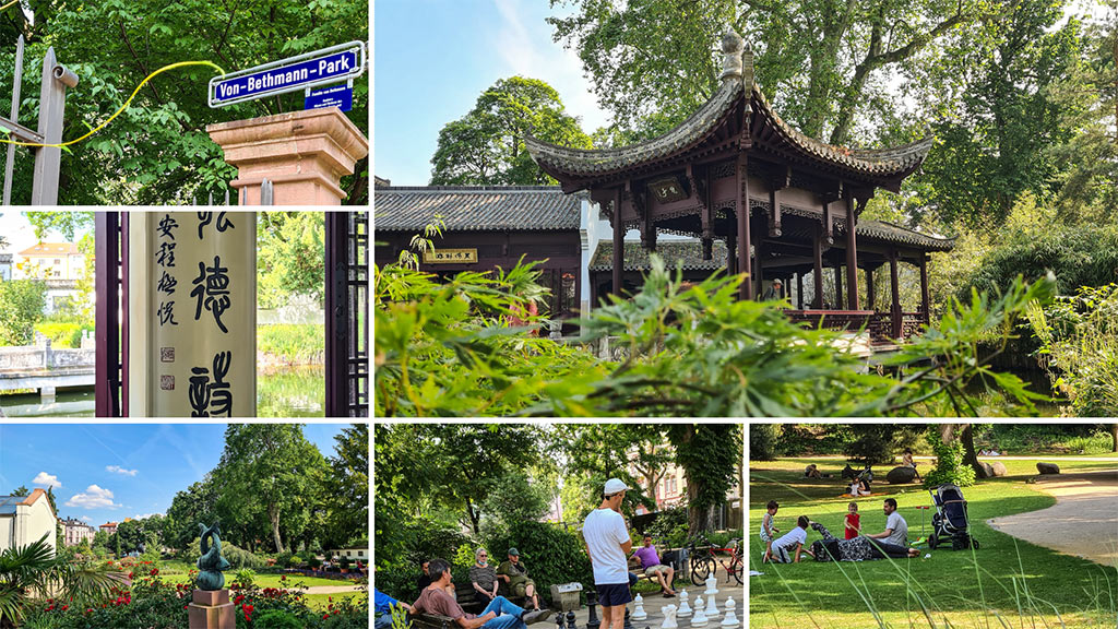 Hinter dicken Mauern verbirgt sich die grüne Stadtoase, weitab scheinen der Verkehr und Lärm der Großstadt. Im Bethmann-Park findet jeder seinen Platz: die Lesenden, die Schach- und Kartenspieler, die Picknicker und die Ruhesuchenden, die im chinesischen Pavillon weilen.