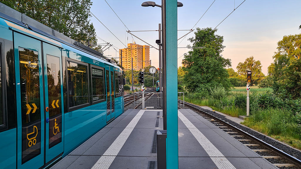 Die Endstation Preungesheim liegt schon ziemlich weit draußen im Nordosten Frankfurt. In Preungesheim wohnen viele Familien, die in der Innenstadt arbeiten. Die U5 ist für sie die klassische Pendlerverbindung. Direkt an der Endhaltestelle gibt es nicht viel zu sehen. Wohnsiedlungen prägen das Bild.