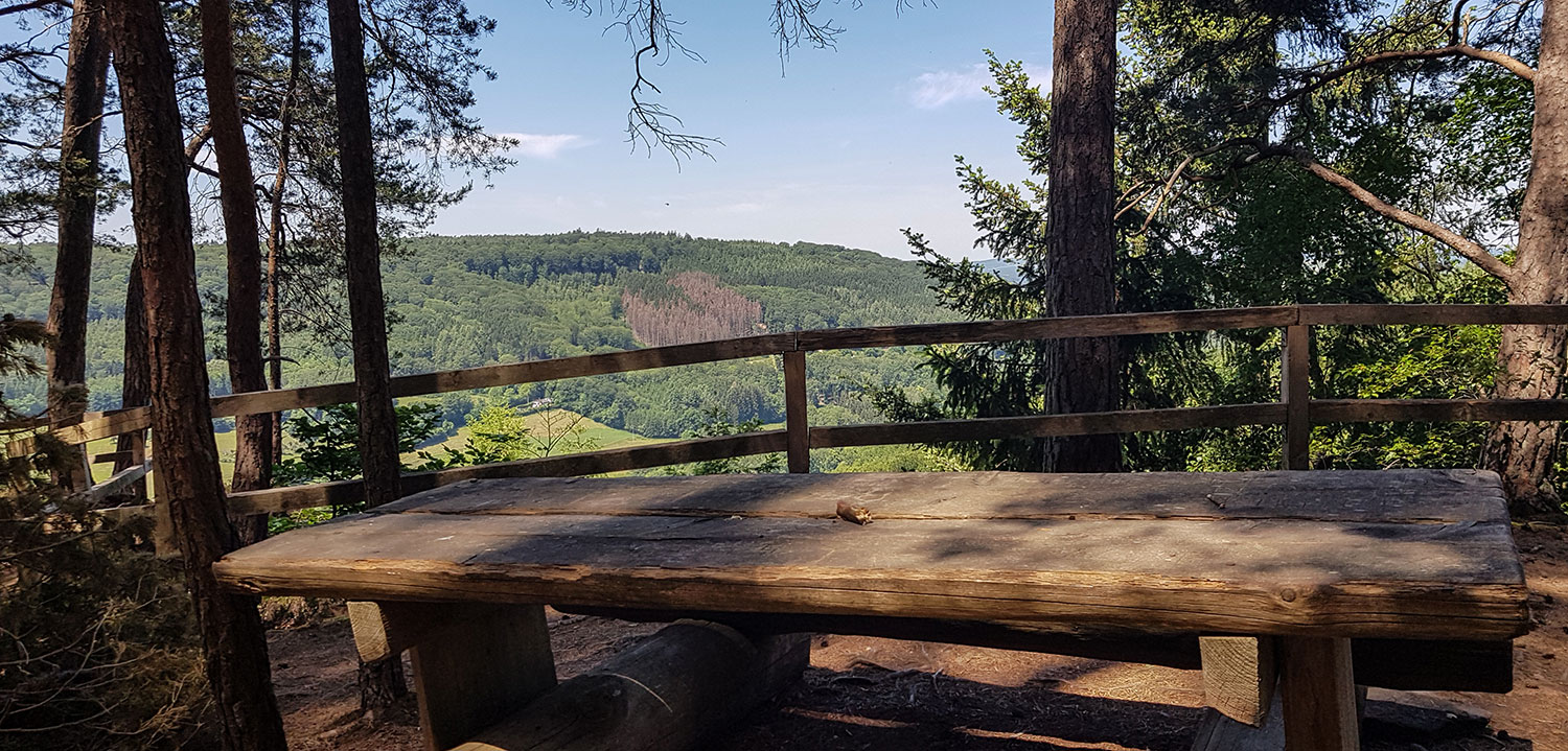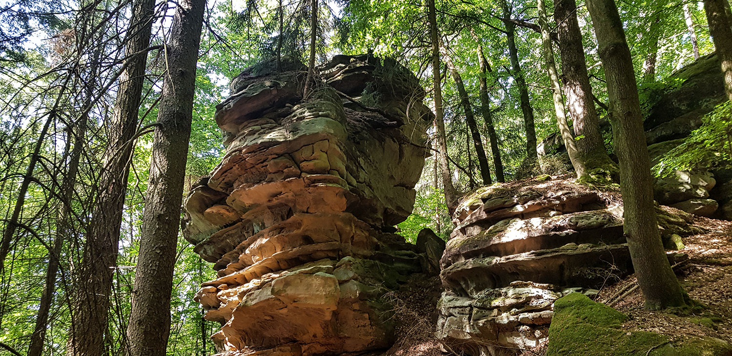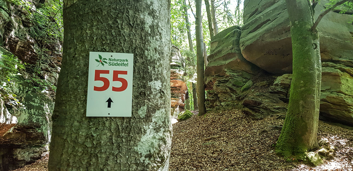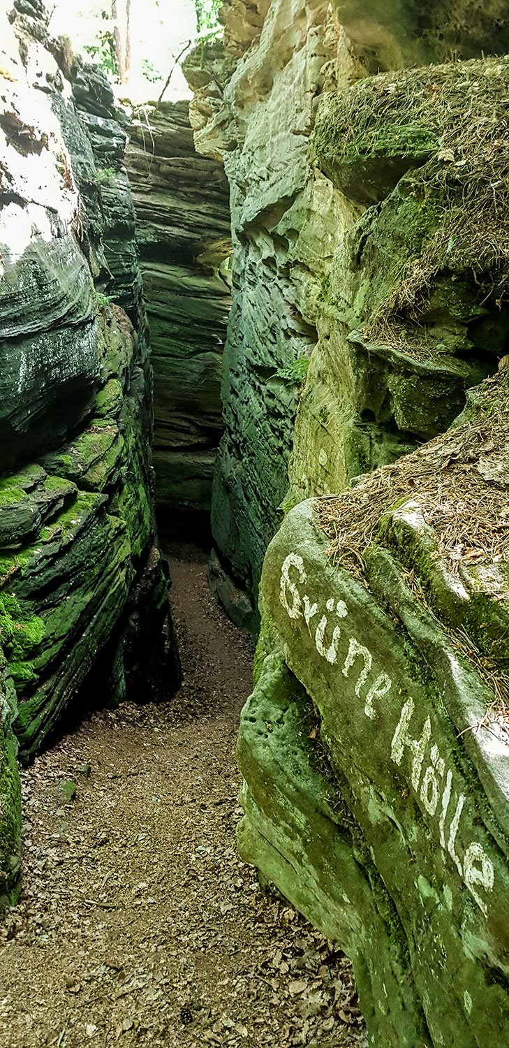 Die Wanderung rund um die Grüne Hölle von Bollendorf ist ein Klassiker und bringt unvergessliche Eindrücke. Bizarre Felse, enge Schluchten und schöne Aussichtspunkte liegen auf dem Weg. Vom Wanderparkplatz geht es zunächst den Schotterweg und später durch den Hohlweg bergauf. Vor der Schutzhütte wendest du dich rechts und folgst der Doppel 55 oder den Hinweisschildern der Audiotour. Die gute Beschilderung führt einmal rund um den Weitberg bis wieder zurück zum Ausgangspunkt. Unterwegs gibt es genügend Ruhebänke und schöne Rastplätze.
