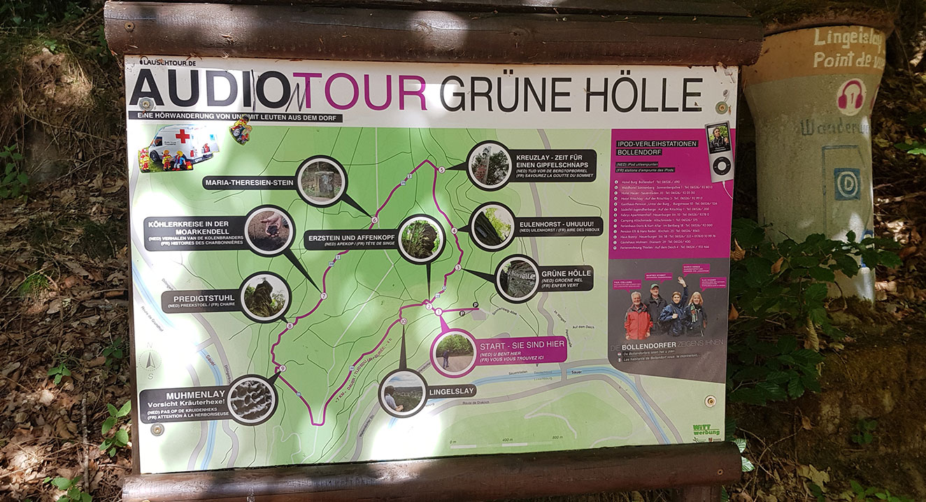 | Sonstiges | Die Wanderung führt durch den Nationalpark Südeifel und das Felsenland Südeifel. In der Nähe ist die „Teufelsschlucht“ mit dem Naturparkzentrum und Dinosaurierpark. Den Rundweg gibt es auch als Lauschtour. An 10 Hörstationen erfährst du alles über Felsen, Tiere und Pflanzen, lernst Kulturdenkmäler, grandiose Aussichtspunkte und die Bollendorfer kennen! |