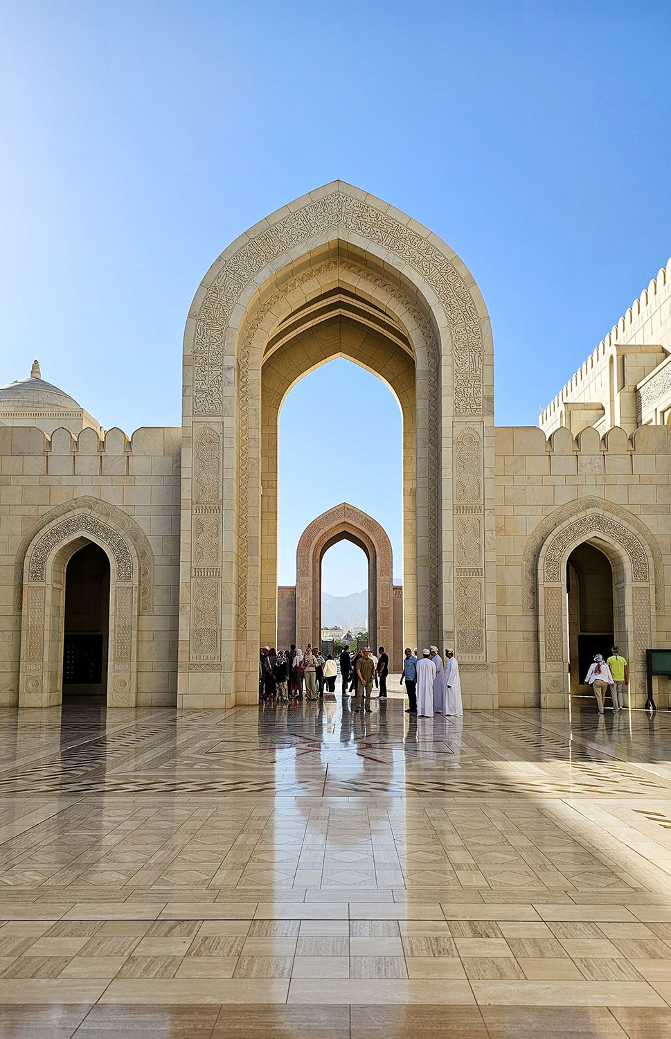 Das Sultanat Oman auf der arabischen Halbinsel ist ein muslimisches Land und nahezu an jeder Ecke steht eine Moschee. Halbkugeln und Minarette bestimmen die Silhouetten. Sehr imposant ist die Große Sultan-Quabus-Moschee in der Hauptstadt Muscat. Sie zeichnet sich durch eine besonders geradlinige Architektur aus, die wie ich finde auf diesem Foto gut zur Geltung kommt.
