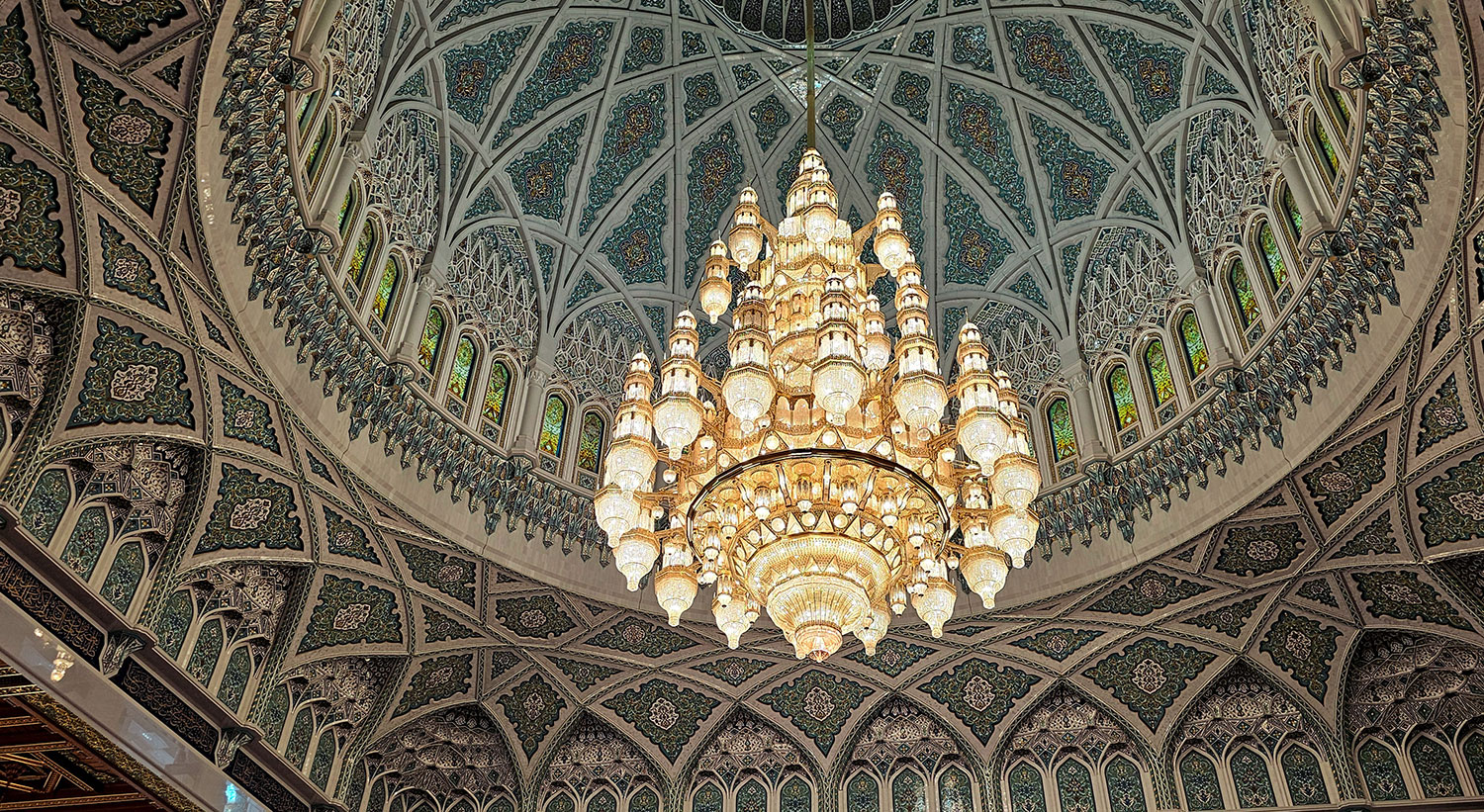 Wenn du in der Sultan-Quabus-Moschee in Muscat den Blick noch oben lenkst, blickst du in auf einen der größten Kronleuchter der Welt. Er ist acht Meter breit, 14,5 Meter hoch und neun Tonnen schwer – das ist in etwa das Gewicht von 6 – 10 Kleinwagen!