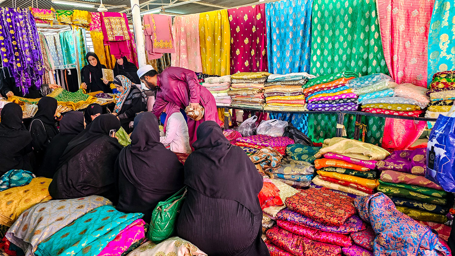 Im Oman hat mich vieles überrascht! Vor allem die Freundlichkeit der Menschen. Das erste Foto zeigt aber etwas anderes. Und zwar tragen viele Frauen eine schwarze Abaya! Darunter verbergen sich aber besonders bunte Kleider und Hosenanzüge. Das Foto ist auf dem Frauenmarkt in Ibra entstanden, wo sich mehrere Frauen fachmännisch von einem Händler Stoffe präsentieren lassen.
