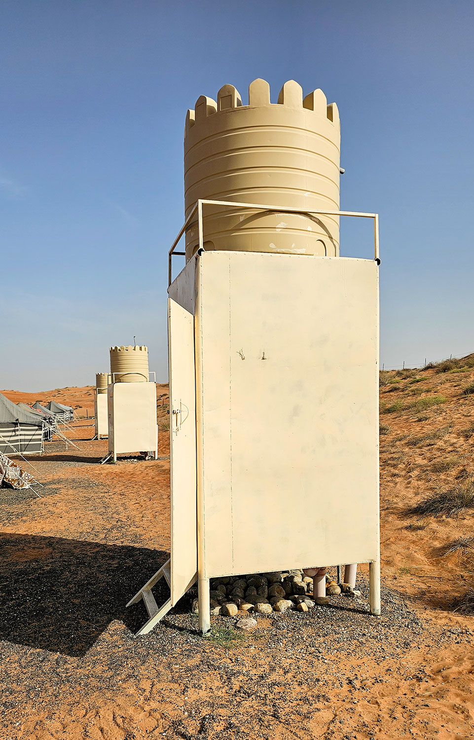 Das zweite Foto zeigt meine Nasszelle mit Toilette und Dusche im Beduinen-Camp in der Wüste. Toll fand ich, das sogar die omanischen Wassertanks das Zickzack-Muster der Burgen und Forts tragen. Am liebsten hätte ich so einen Tank mit nach Hause genommen.