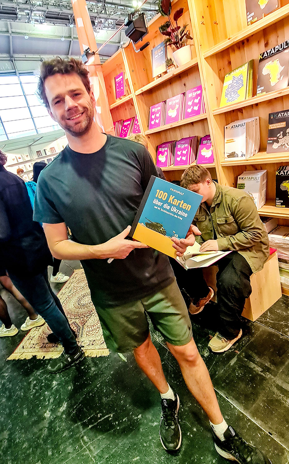 Es begann mit den Grafiken, dann wird ein Magazin daraus und schließlich ein Verlag gegründet. Katapult ist mit der grafischen Darstellung von Statistiken und Studien der Sozialwissenschaften in eine Marktlücke gestoßen und hat eine fulminante Erfolgsstory hingelegt. Gründer Benjamin Fredrich erzählt mir, wie sie dieses Jahr in nur vier Wochen den Atlas zur Ukraine gestemmt haben. Mein Lieblingsbuch: „55 kuriose Grenzen und 5 bescheuerte Nachbarn“ – da kommt dreimal die 5 drin vor!