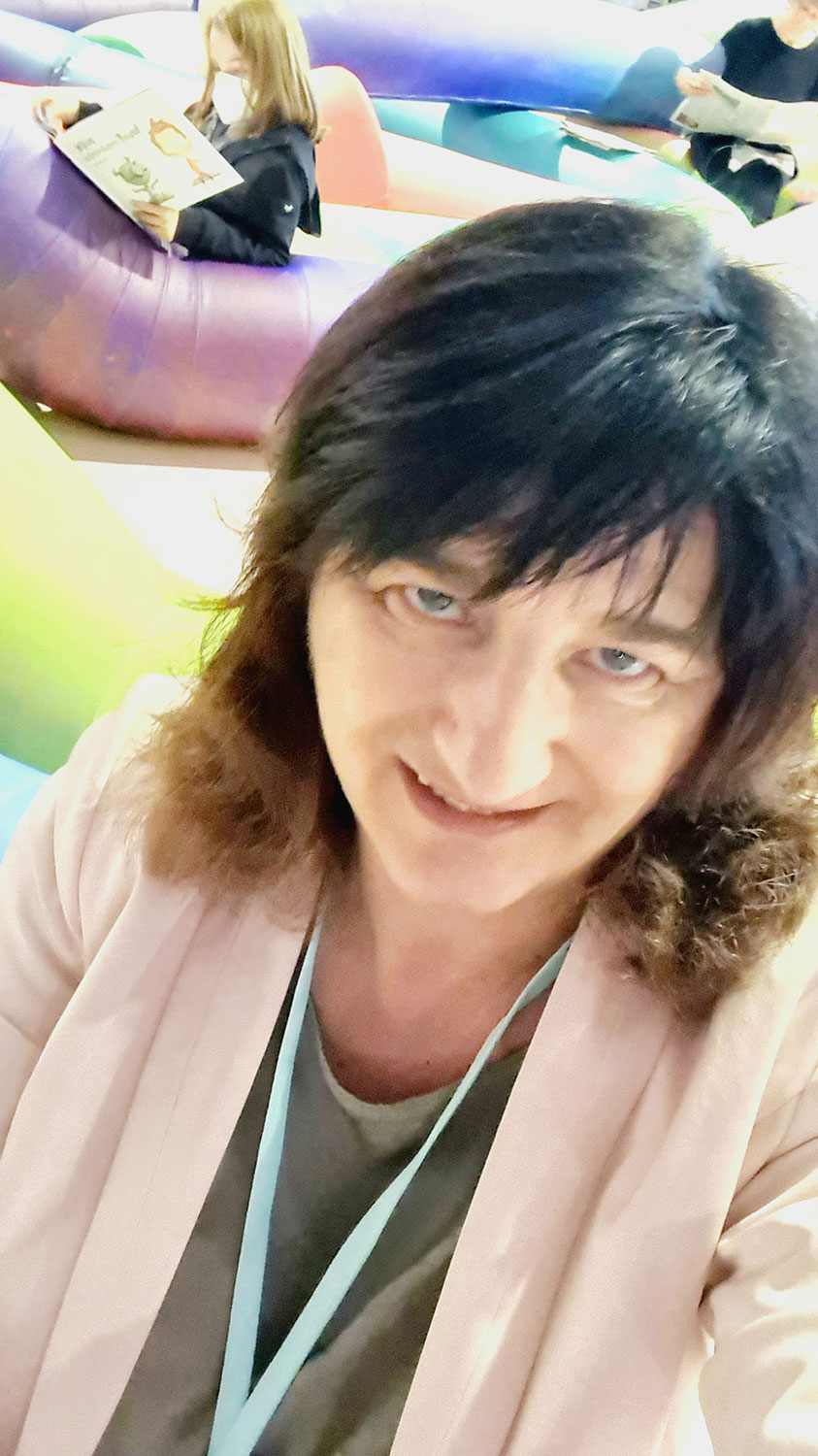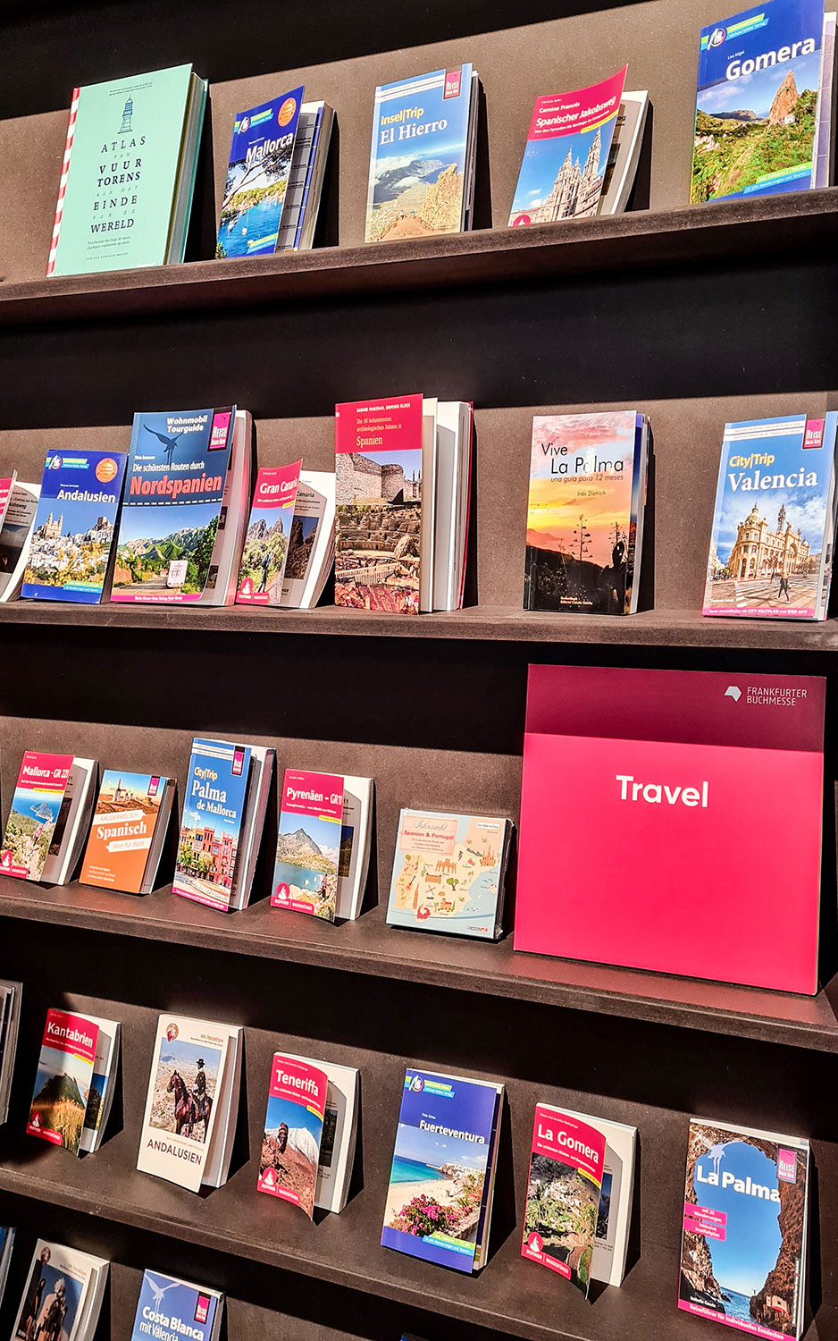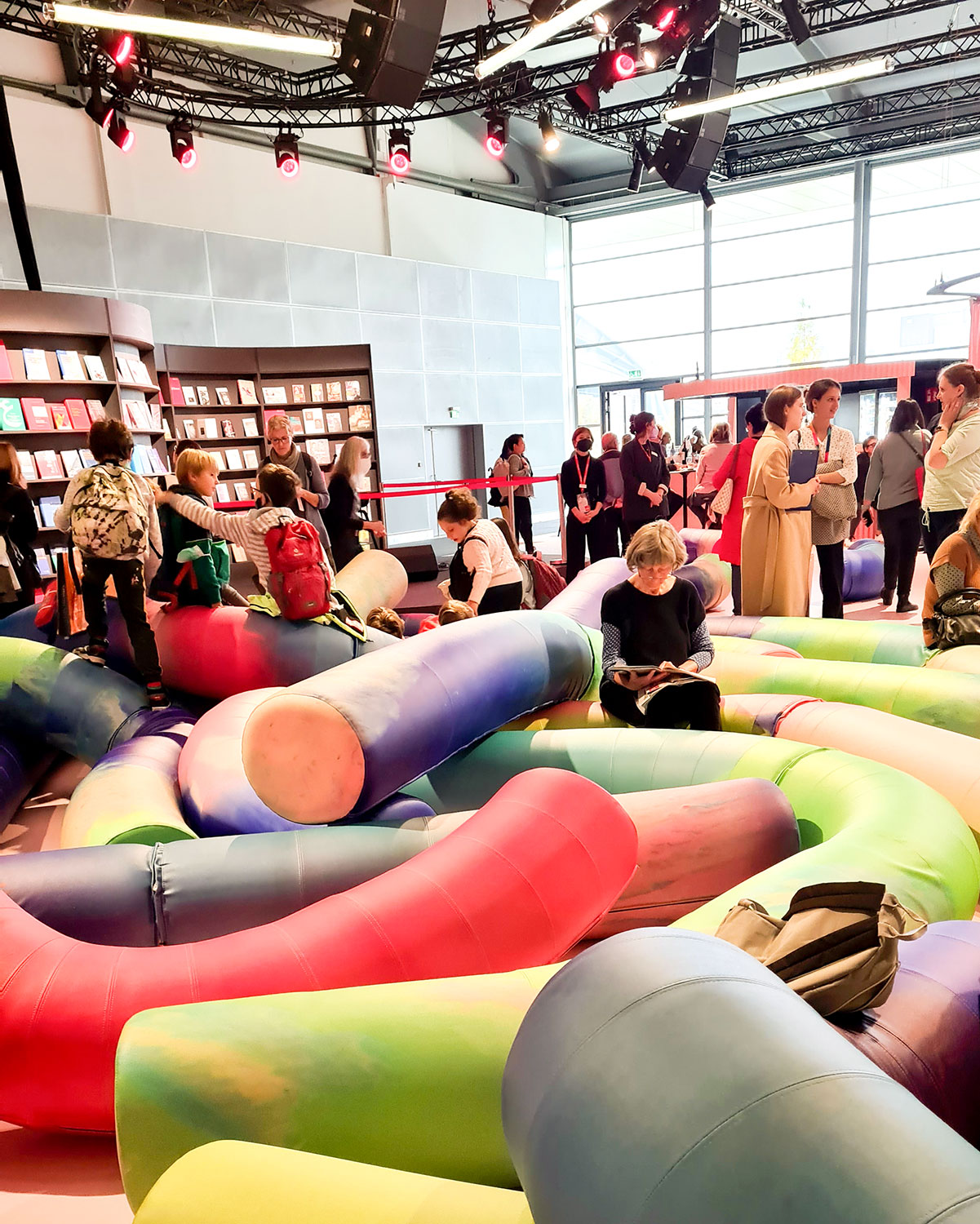 Weil ich weiß, dass die Frankfurter Buchmesse riesig ist, habe ich mich von Anfang an fokussiert: auf den Ehrengast Spanien und die Reisebuchverlage in Halle 3.1. und vielleicht noch 3.0. Halte Ausschau nach meinen Themen: Städtetrips, Zugreisen und Weltreise. Als Erstes steuere ich Ehrengast-Pavillon an. „Sprühende Kreativität“ ist das Motto mit dem sich Spanien präsentiert. Auf einer Seite des Pavillons hängen transparente Stoffbahnen von der Decke auf die Buchstaben projiziert werden. Es gibt interaktive Stationen und Bühnen für Gesprächsrunden. Auf der anderen Seite tummeln sich bunte Schaumstoffrollen auf dem Boden und laden ein, sich hinzusetzen und in einem der vielen Bücher zu schmökern.
